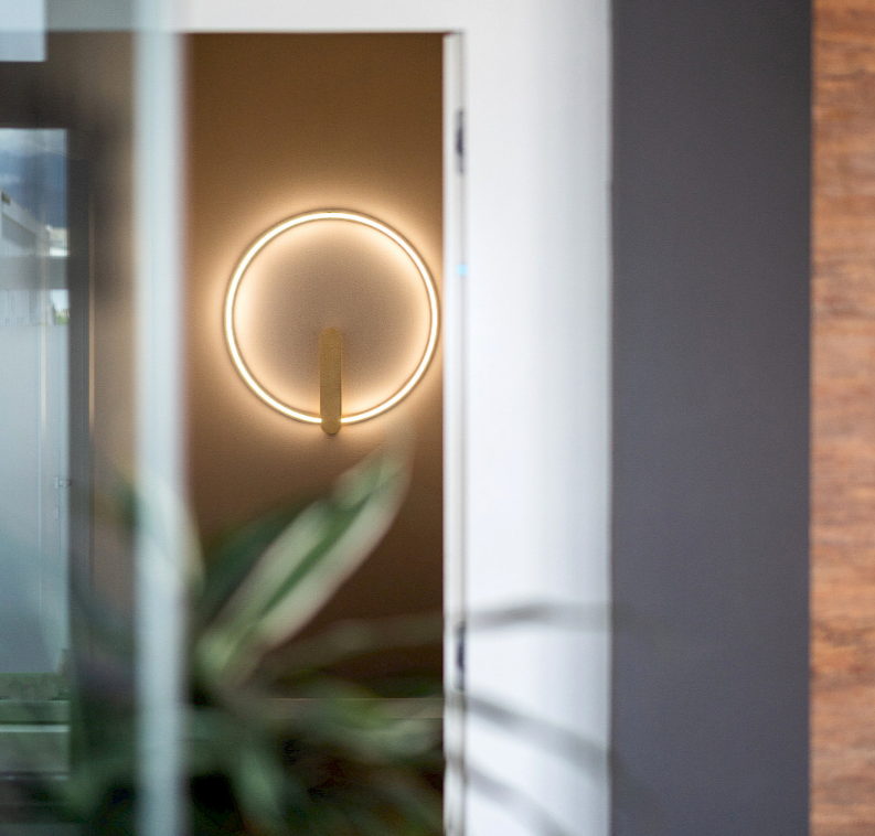 Versiune aplica de perete disponibilă în două dimensiuni în finisaje standard sau speciale precum auriu, cupru, bronz. Ideal pentru aplicații rezidențiale. Poate fi aplicat și pe tavan. Opaca emisie de lumină omnilight OnOff, Dimmable Dali+Push sau Phase cut. Sursa de alimentare este la distanță în interiorul copertinei.