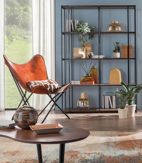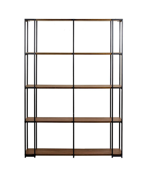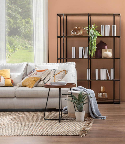 Bibliotecă cu 4 rafturi cu structură metalică neagră și rafturi din MDF melaminat de culoarea lemnului închis. Un accesoriu de mobilier perfect pentru proiectarea unui mediu minimal și sofisticat. Ideal de combinat cu măsuța de cafea rotundă de inspirație contemporană pentru un fir comun cu un design modern.