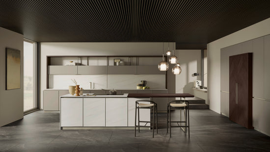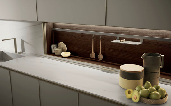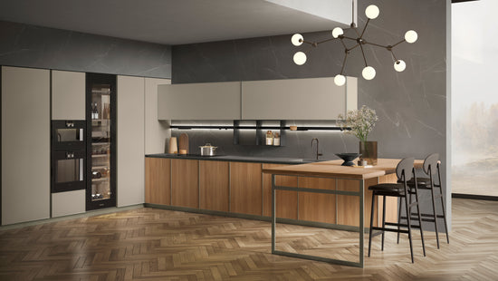 Noul design caracterizat prin cadrul subțire al ușilor, elementul grafic și modular de pe fațadă, absența mânerelor face această bucătărie compatibilă cu orice mediu.