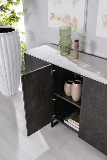 Clasic și grațios, bufetul Alpha din MDF furniruit se remarcă prin caracterul său modern și liniile curate. Blatul din ceramică in finisaj de marmură Calacatta cu vene delicate se sprijină pe structura rafinată, dar discretă, de stejar gri închis. Mecanismul push&pull cu inchidere amortizata si dimensiunile compacte de L.160 x P.40 xH. 85 cm fac ca aceasta piesa de mobilier sa fie compatibila cu locuintele moderne care favorizeaza functionalitatea, dar nu renunta la o nota de clasa.