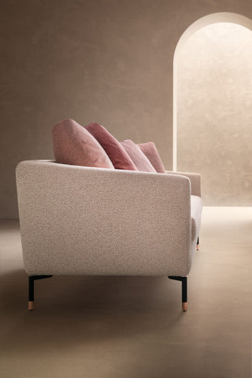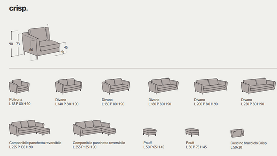 Canapeaua Crisp din colectia Essential, cu spatele fix, explorează un design compact în care ies în evidență detaliile de culoare cu spirit contemporan.