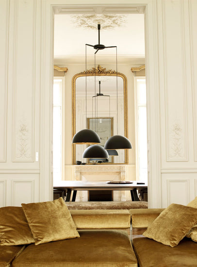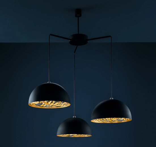 Materiale - structura metalica; emisferă din aluminiu cu suprafață interioară neregulată căptușită cu frunză de culoare auriu/argintiu/cupru, exterior negru mat, suport de lampă din oțel.