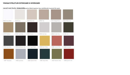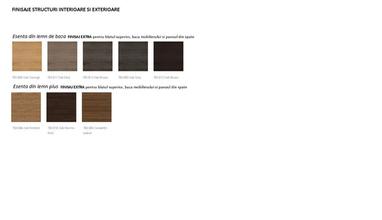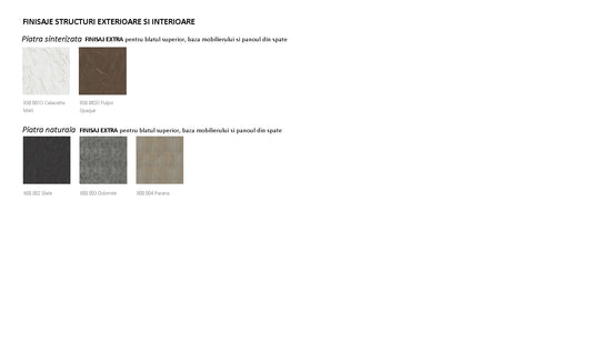 Este tarifata suplimentar, ca extra optiune, alegerea unui finisaj extra pentru blatul superior, baza mobilierului si panoul din spate.