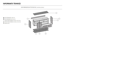 Carcasa structurală este caracterizată prin polite inferioare și superioare, panouri din spate și pereți despărțitori. Spatiile interioare sunt impartite de rafturi din sticla.