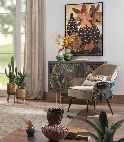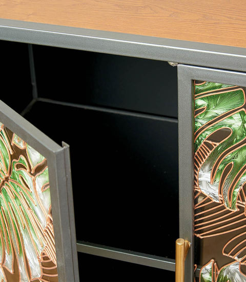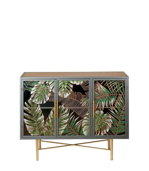 Comoda cu trei uși cu structură din lemn și metal. Ușile, înfrumusețate cu detalii din sticlă decorată, evocă frumusețea și misterul pădurilor tropicale. Un accesoriu de mobilier capabil să încânte privirea. Un detaliu rafinat pentru toți iubitorii de mobilier Ethno Chic.