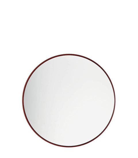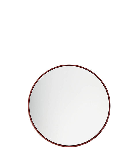 Oglindă rotundă din metal roșu Merlot. Un accesoriu de mobilier cu o eleganță minimă pentru a vă mobila și ilumina camerele. Disponibil pe negru și, de asemenea, la dimensiuni mici.