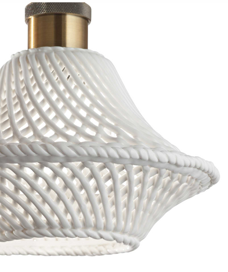 Corp de iluminat de tavan din metal lăcuit mat. Cablu de alimentare acoperit cu material textil cu capac de soclu din metal antic din alamă. Difuzor ceramic.