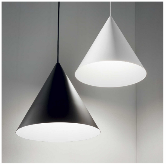 Corp suspendat de tavan din metal vopsit cu pulbere. Difuzor metalic lacuit alb mat sau negru alb la interior. Cablu de alimentare acoperit cu material textil.