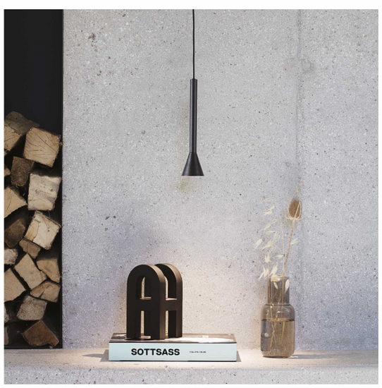 Corp de iluminat cu difuzor din metal vopsit sau placat cu pulbere. Cablu PVC negru. Culoare: negru, nichel satinat sau alamă satinată.