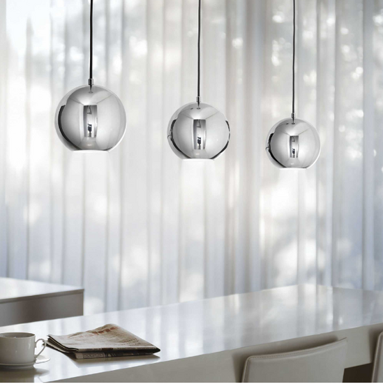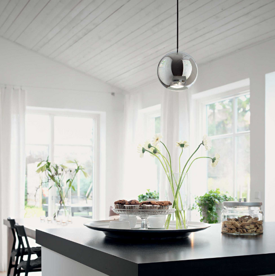 Cadru metalic si difuzor sferic cu finisaj alb, crom sau negru. Cablu electric acoperit cu material textil.