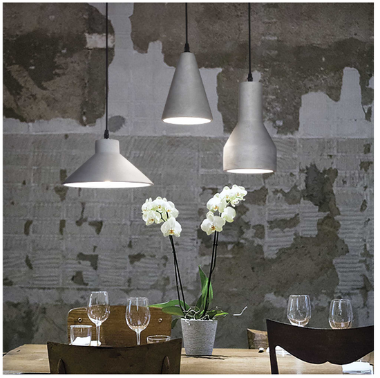 Cadru metalic cu finisaj negru mat. Difuzor de beton. Model 110462 livrat cu cablu electric de 12 metri lungime acoperit cu material textil. 6 cârlige de montare și mufă italiană care poate înlocui cupa de tavan.
