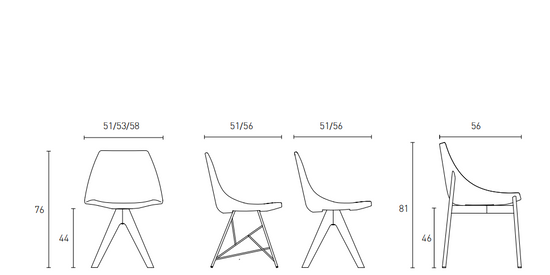 Liniile întrerupte și culorile vii îmbogățesc diferențele dintre baze, care sunt ușoare și stabile. Caracteristica semnăturii este șezutul său: forma, care amintește de secțiunea transversală a unui ou, este concepută pentru a fi confortabilă și încântătoare, atât în varianta rigidă lăcuită, cât și în versiunea căptușită, cu huse nedetașabile sau libere, disponibile în material textil, piele și piele sintetică. Baza este variabilă și vine în trei versiuni: stâlp metalic, picioare înclinate din lemn masiv și bază tubulară.