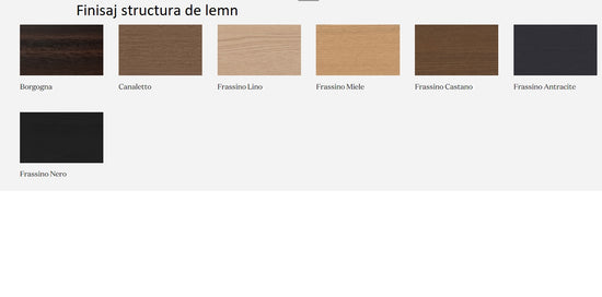 Finisaje lemn :Burgundia, Canaletto,Stejar gri, stejarStejar natural, afumat,Stejar Lagoon, StejarTutun