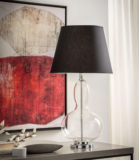 Lampă de masă din sticlă cu abajur din material alb sau negru . Designul minimal este impodobit de silueta sinuoasa a suportului de sticla, pentru un efect de eleganta sofisticata cu gust contemporan.