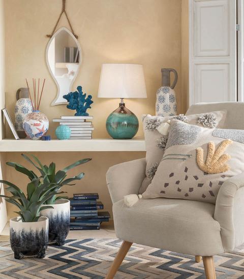 Lampă de masă din ceramică cu abajur din material textil. Un accesoriu de mobilier care, prin nuanțele sale de culoare unice, conferă casei tale o atmosferă mediteraneană fascinantă.