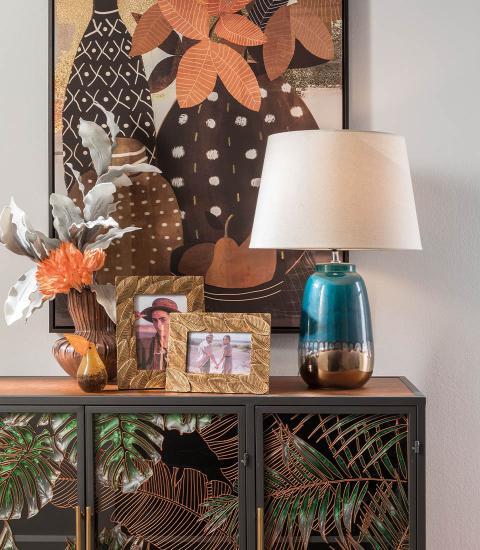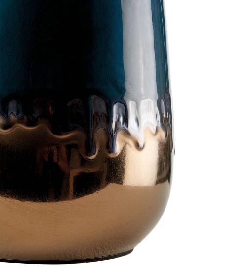 O lampă de masă din ceramică cu abajur din material textil. Nuanțele irizante de la turcoaz la petrol se amestecă cu detalii aurii prețioase pentru un accesoriu de mobilier care reușește să surprindă