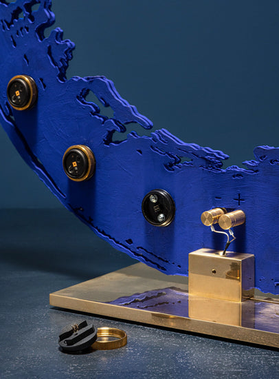 baza si detalii din alama, structura metalica, suprafata exterioara neregulata pictata manual albastru