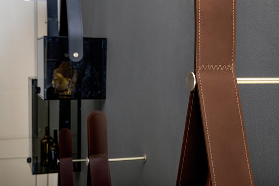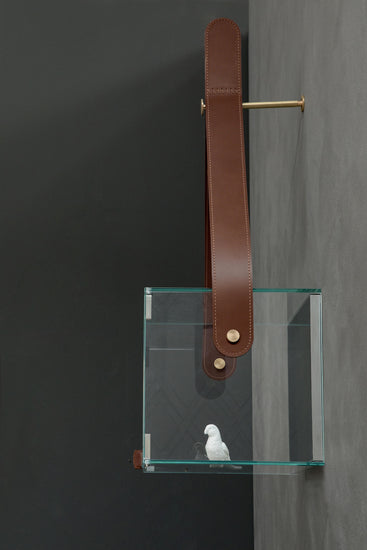 Vitrina Chèri de Tonin Casa este o vitrina de perete din sticla cu detaliu din piele si suport metalic cu finisaj alama satinata. Vitrină elegantă din cristal, cu spate oglindă și decorată cu detalii din piele fină și concepută pentru a îmbogăți livingul casei cu stil.