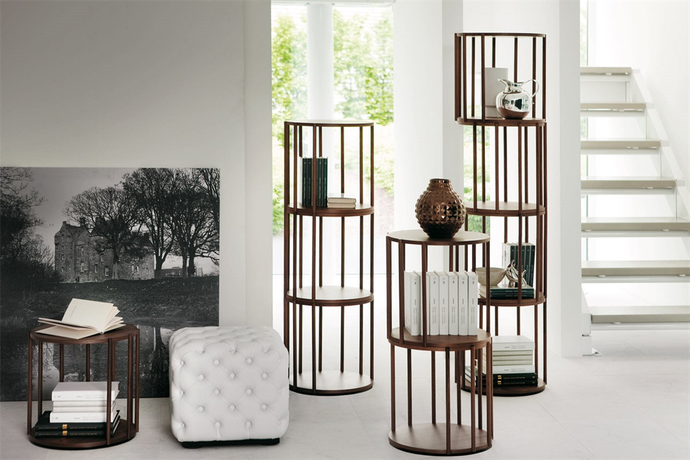 Bibliotecă sau măsuță de cafea cu structură din nuc canaletta masiv. Modul unic stivuibil și pivotant. Materialul si felul in care a fost lucrata fac aceasta biblioteca opera de arta.