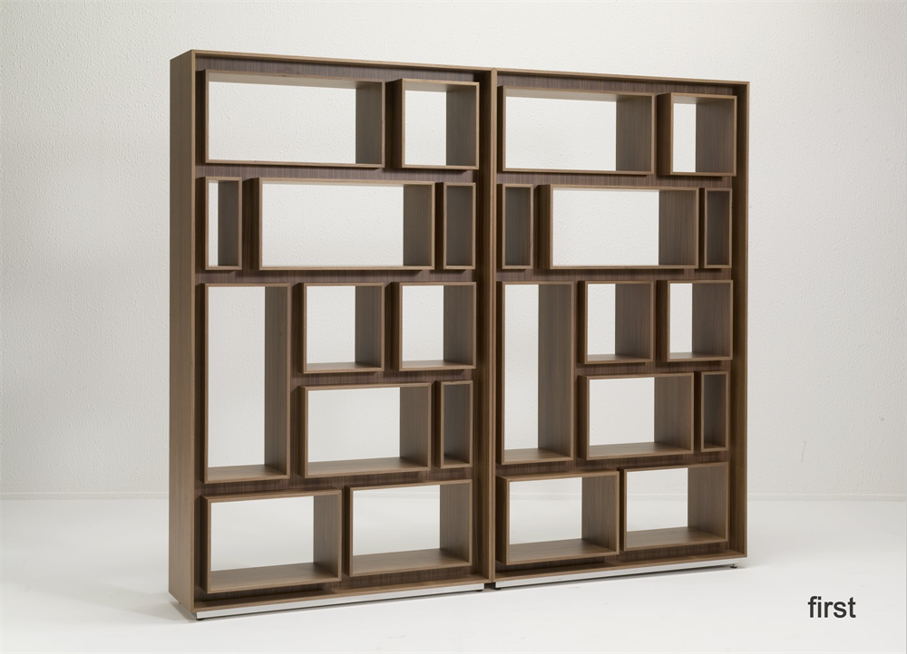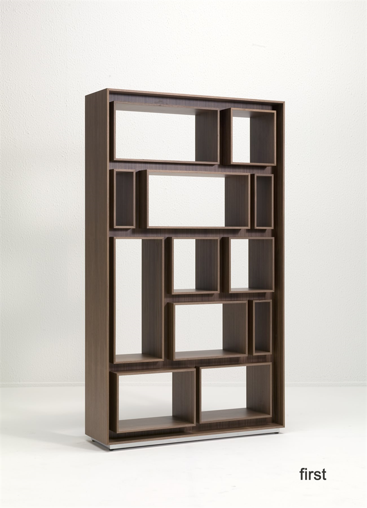 Bibliotecă din nuc canaletta cu bază cantuita de oțel. Forme remarcabile, la fel ca si materialul folosit. Poate imbraca un perete intreg modulele putand fi puse unul langa celalalt.