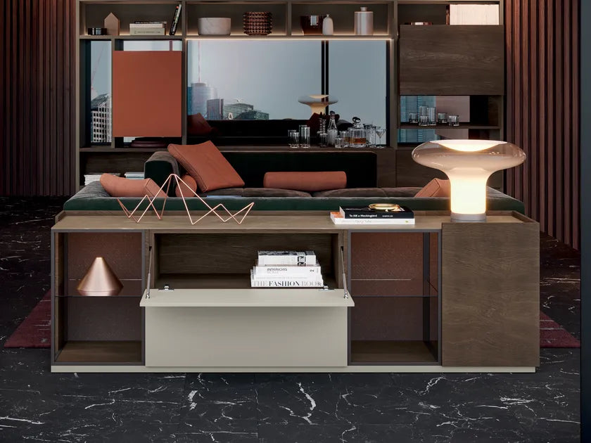 Modulul Teca Midi poate fi folosit ca element terminal pe stânga și/sau dreapta. Structura metalica din fier lăcuit tubular de 15x15mm este întotdeauna echipat cu un panou din spate, din panou de finisare pe jumătate și ușă specială cu balamale „în formă de L” echipată cu balama, arc și percutor de blocare. Spate personalizabil și iluminare LED integrată opțional.