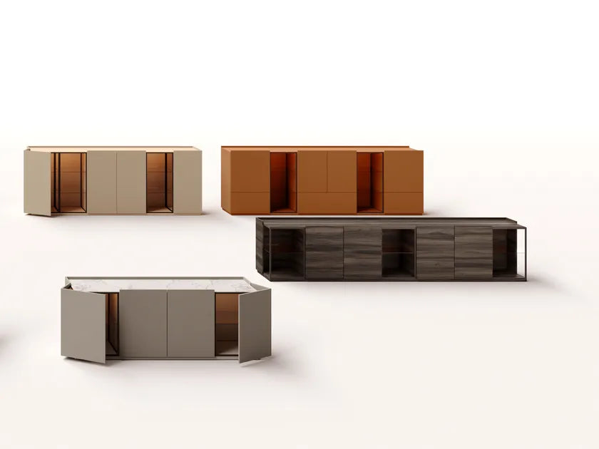 Iluminare optionala. LED-urile prezente, integrate în profilele carcasei, pot fi gestionate în funcție de trei opțiuni diferite. aceste opțiuni gestionează iluminarea completă a compozițiilor de bufet Emme.
