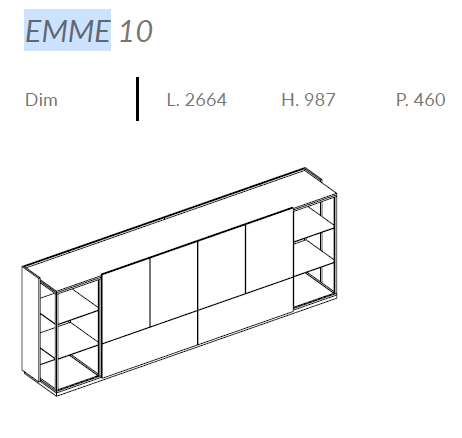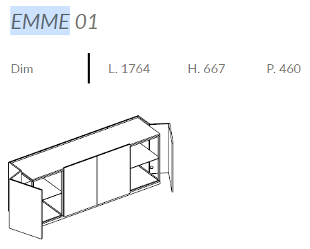 Comoda care personalizeaza spatiile cu diferite forme si culori intercalate cu structuri solide, elegante. Emme este disponibilă în versiunile 01 până la 12. Are mai multe module de cutie dedicate care pot fi folosite în designul compoziției. Modulele cutiei variază în înălțime și lățime, precum și în configurație. Modulele cutie sunt întotdeauna echipate cu panouri din spate.