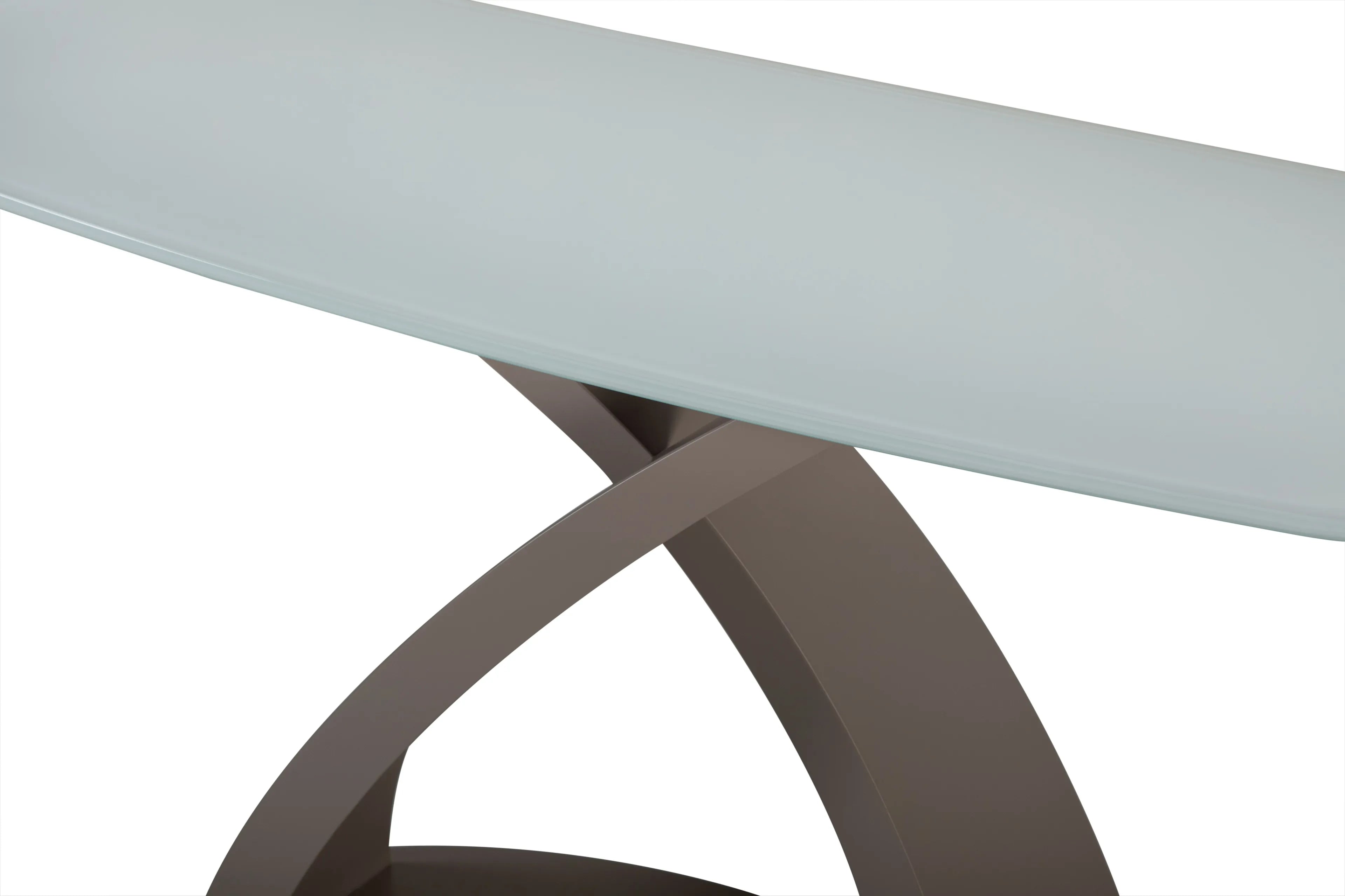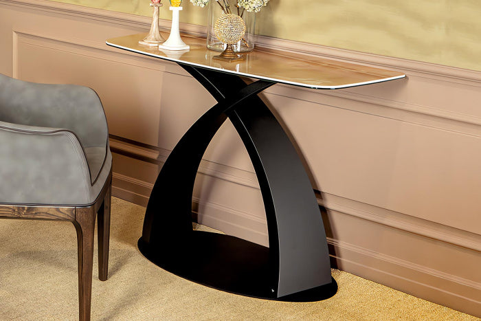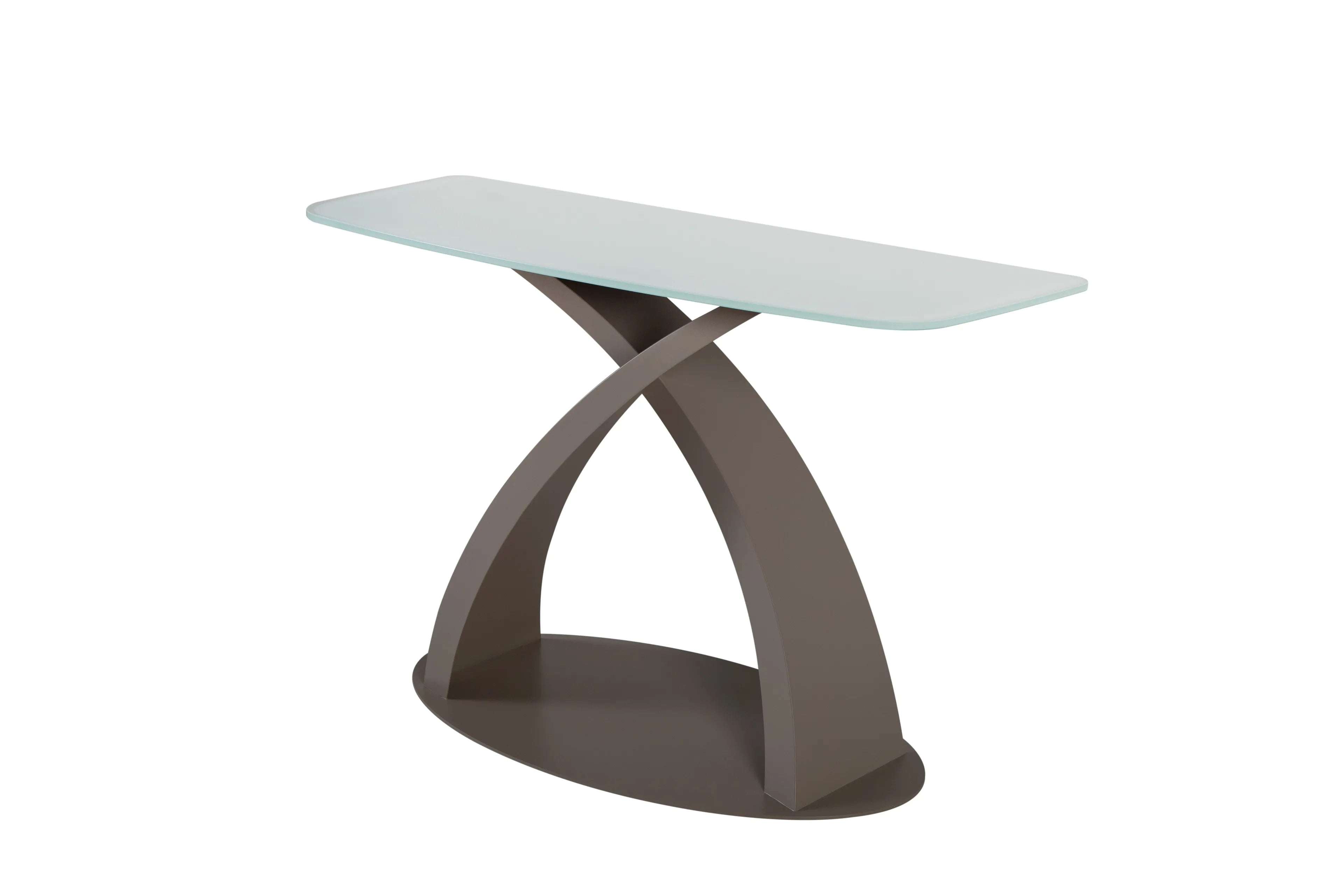O lejeritate eleganta invaluie consola Eliseo, cu baza din otel cu diverse finisaje. Blatul din sticla, alb extra clar sau bej extra clar, se asorteaza cu baza din otel vopsit disponibila in diferite finisaje: alb mat, negru mat, noroi mat, piatra mata bronz, piatră periată bronz sau cupru periat.
