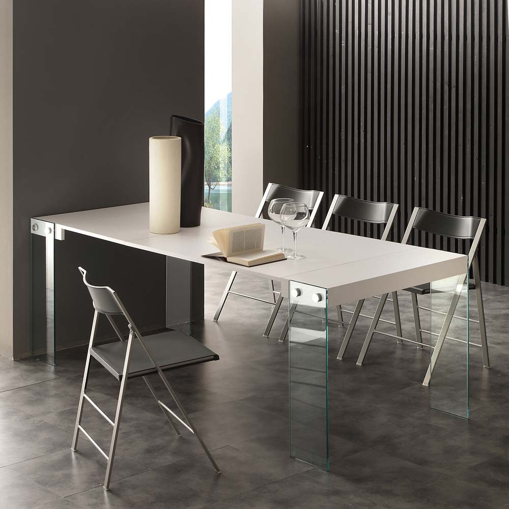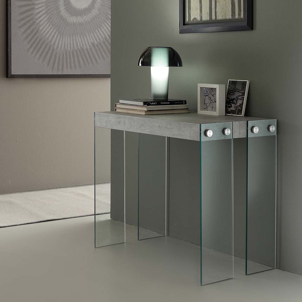 Consola extensibila cu blat gros in doua finisaje ce imita cimentul si cu picioare din sticla temeperata.