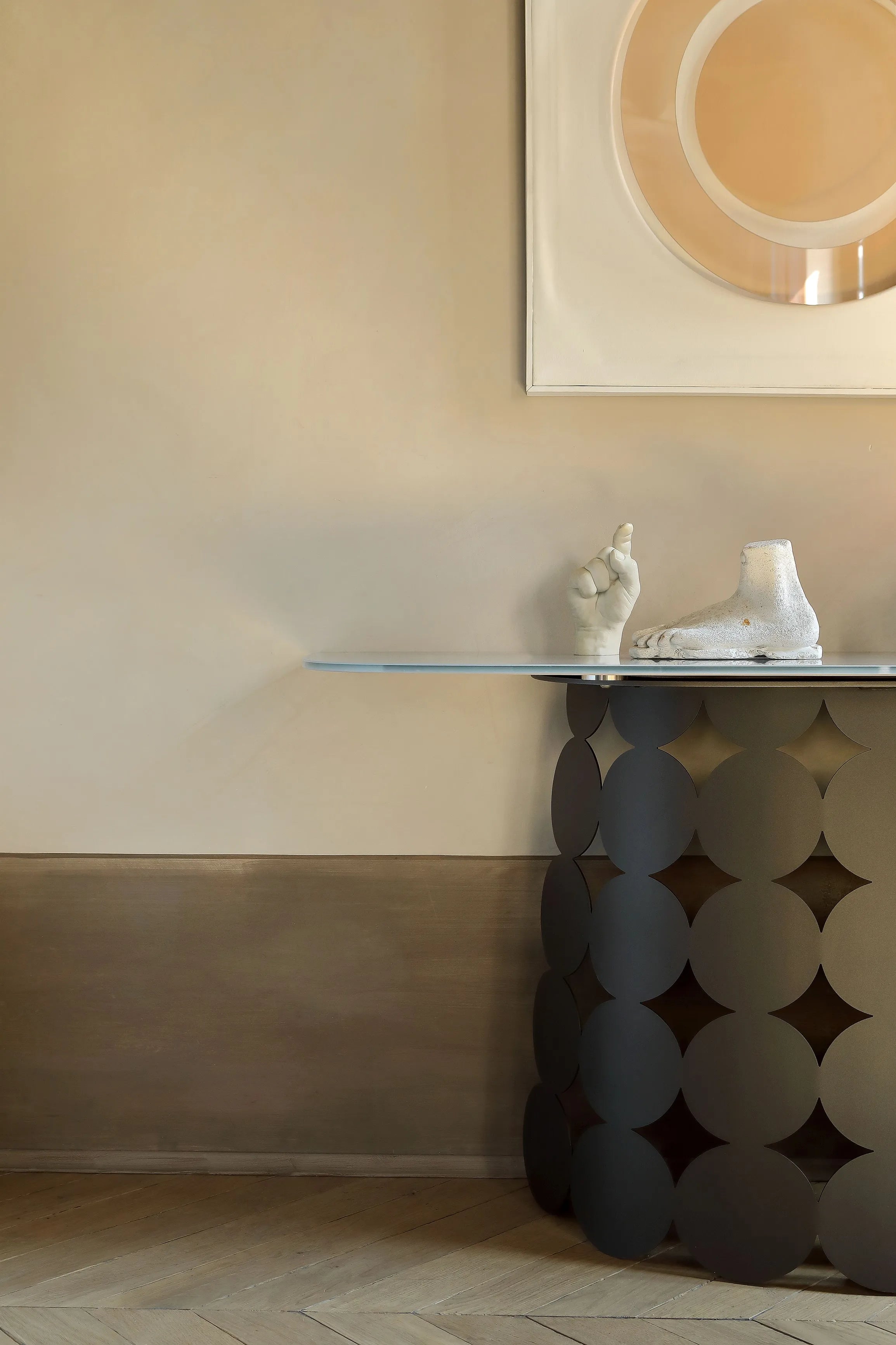 Gustul și memoria vremurilor vechi, care au prins viață datorită unei tehnologii contemporane create de baza Pois: combinația de artă și măiestrie. Metalul lăcuit se dezvăluie într-o fantezie de deschidere și închidere a spațiilor, pentru a susține perfect blaturile din lemn masiv sau porțelan ale mesei protagoniste în fiecare living.