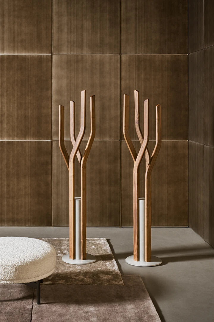 Alma este un cuier elegant, montat pe podea, care se inspiră din lumea fascinantă a plantelor, a căror vitalitate naturală o evocă printr-o cercetare formală riguroasă. Este alcătuit dintr-o bază de beton pe care stau în contrast cele patru tulpini din lemn masiv cu profile geometrice și care vin în înălțimi diferite. Datorită diferitelor orientări și linii sinuoase, se creează un efect de spirală extrem de dinamic, în care baza de beton acționează ca pivot. Alma este un accesoriu cu o personalitate sofisticată și elegantă care devine o prezență totemică, ideală pentru „însuflețirea” atât a mediilor rezidențiale, cât și a spațiilor de cazare.