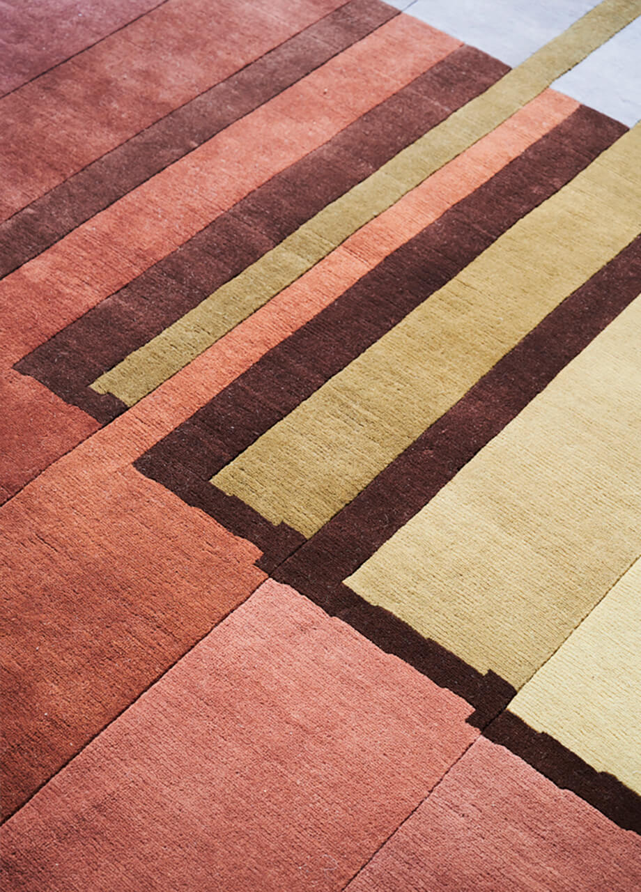 Efectul de refracție dat de sticla ondulată este laitmotivul seriei RD Braque, o colecție de covoare cu referințe puternice la lumea designului arhitectural. Un studiu atent al culorilor și infinitelor declinații ale acestora conferă un efect pictural suprafeței covoarelor, înnodate manual în prețioasă lână din Noua Zeelandă.