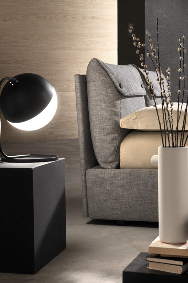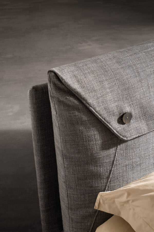 Un pat cu design modern. Spatarul imita doua buzunare foarte mari cu nasturi. Ca si finisaje putem alege dintr-o gama variata de culori si de materiale. Structura patului este din pal iar somiera este din lemn stratificat. Poate avea spatiu de depozitare.