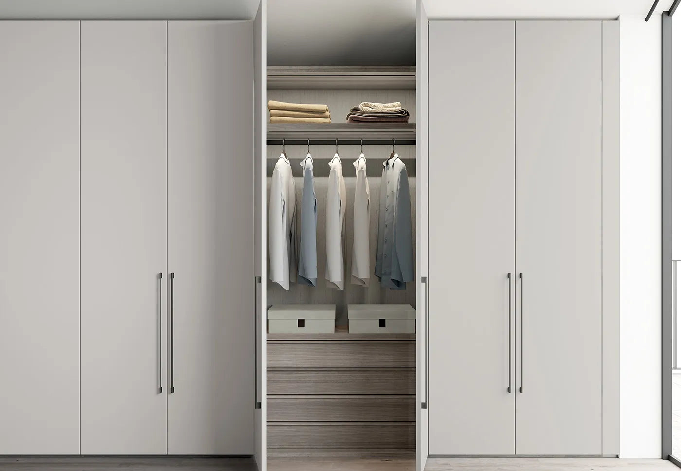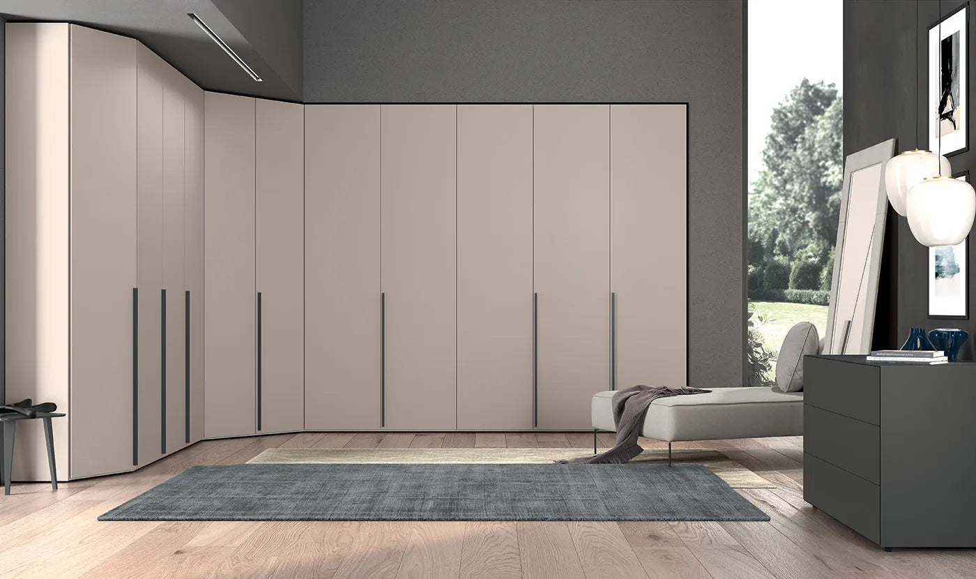 Dulap modular Concreta cu usi batante. Poate fi accesorizat cu mai multe tipuri de manere. Disponibil in mai multe finisaje.