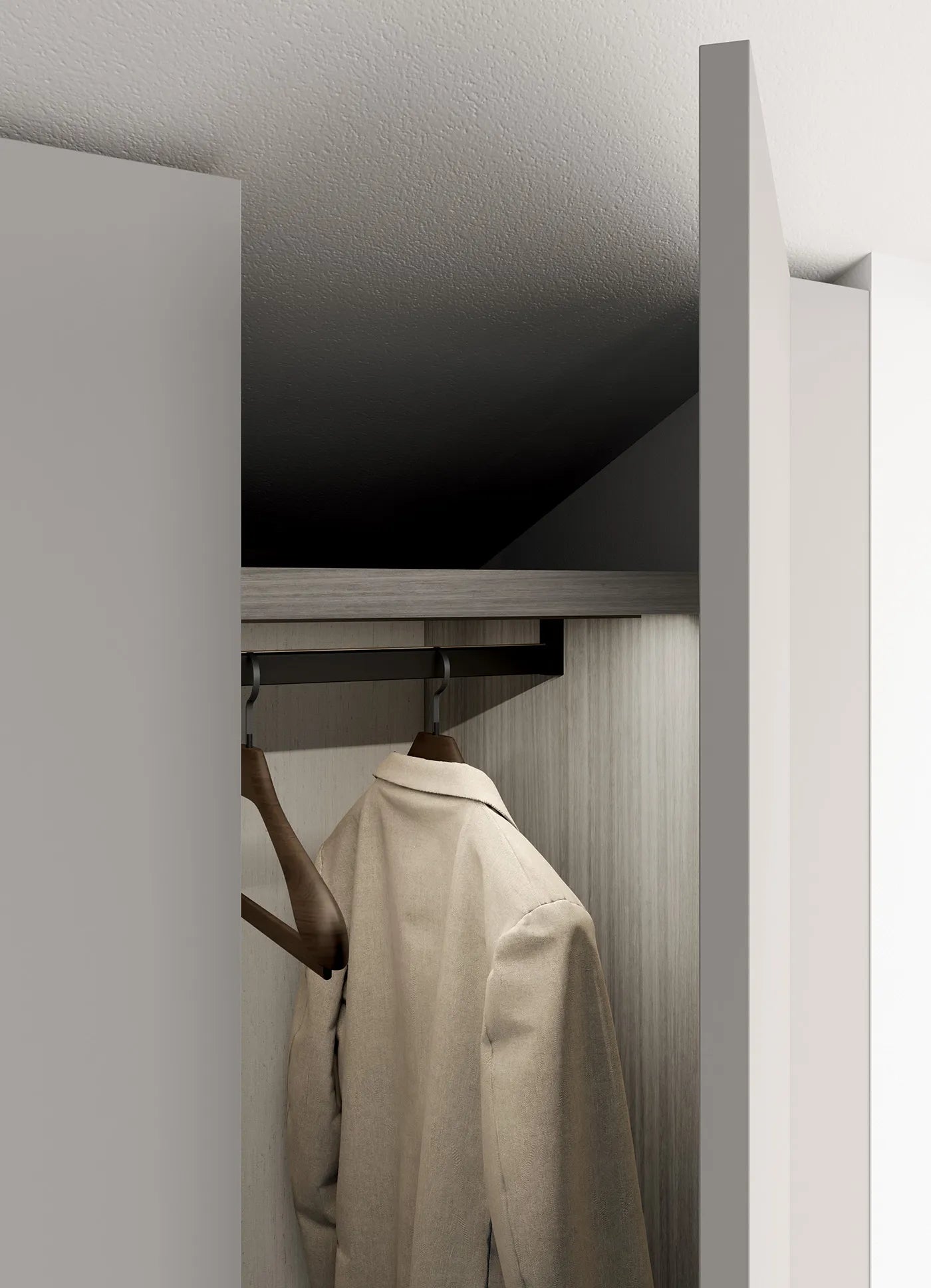 Fiind modular el poate fi adaptat pe dimensiunea dorita si accesorizat dupa preferinte. Putem adauga iluminare cu led, sau alte accesorii pentru depozitare, cum ar fi bari de umerase pentru pantaloni, bari de umerase rabatabile pentru compozitiile mai inalte, sau polite pentru pantofi.