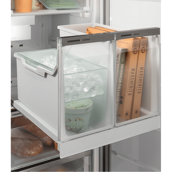 Graţie rezervei de cuburi de gheaţă de 8 kg, sistemul IceTower asigură condiţiile ca băuturile reci să nu se termine niciodată la petrecerea dumneavoastră. Lopăţica pentru cuburi de gheaţă şi placa extensibilă pe şine telescopice fac posibil un acces confortabil la cuburile de gheaţă. Datorită tăvii suplimentare de inserţie, puteţi depozita şi cantităţi mai mici de gheaţă şi puteţi păstra dedesubt alimentele congelate. Sertarul alăturat oferă spaţiu de depozitare pentru articole congelate.