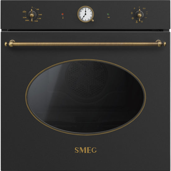 Usa cuptorului este de metal de culoare crem sau neagra, iar manerul este de metal in finisaj de alama.