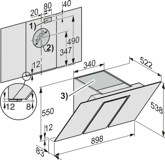 | Distanță de siguranță minimă deasupra plitelor cu gaz (putere totală max. 12,6 kW, arzător ≤ 4,5 kW) în mm |