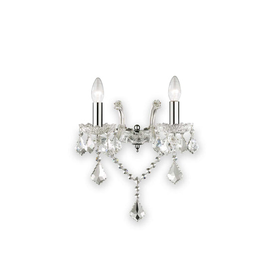 Cadru metalic cu elemente decorative din sticla. Pandantive cu octogoane și picături finale în cristal tăiat. Disponibil în versiuni cu sticlă transparentă și metal auriu sau cromat.
