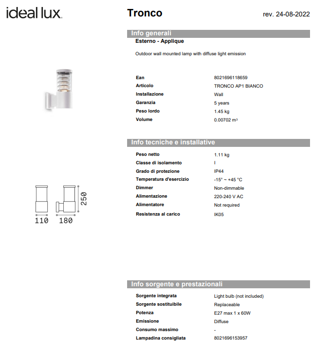 Corp de iluminat din aluminiu turnat sub presiune, finisat în vopsea antracit, alb, gri sau negru. Difuzor din sticla Pyrex cu elemente interne din aluminiu.