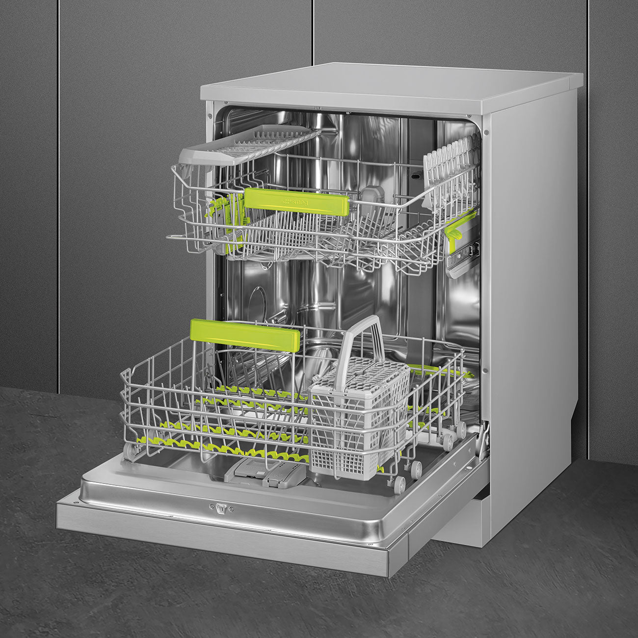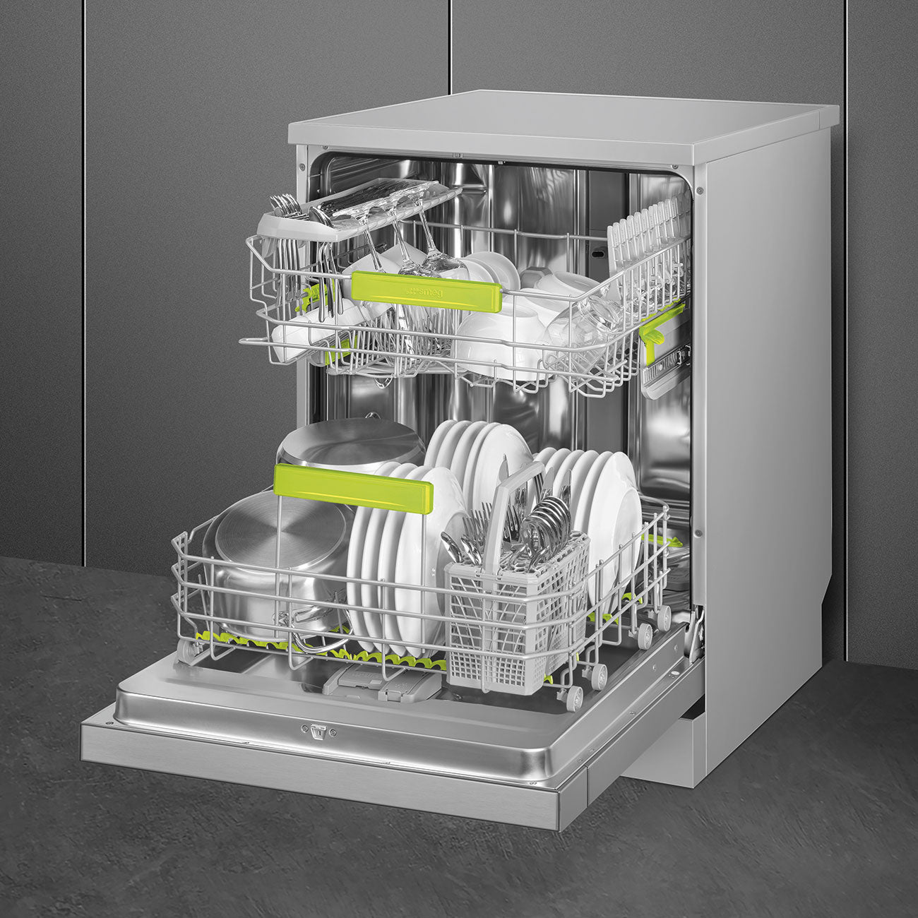 Orbital wash system distributes water evenly throughout the 60cm dishwasher cavity, directing water with precision to ensure an excellent wash. Total Acquastop: In addition to the partial Acquastop protection present in all Smeg dishwashers, some models have an electronic device fitted to the water intake hose, which monitors water levels in the machine, detects leaks in the hose and switches off the water supply immediately when necessary. The work aimed at continuous improvement has allowed the creation of the second generation of the Inverter motor 2.0, characterised by greater efficiency and durability over time,