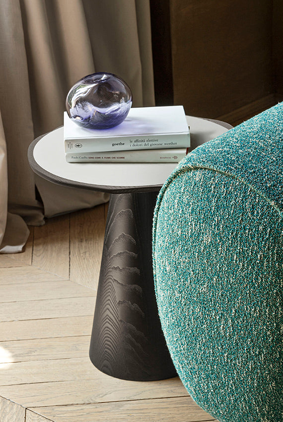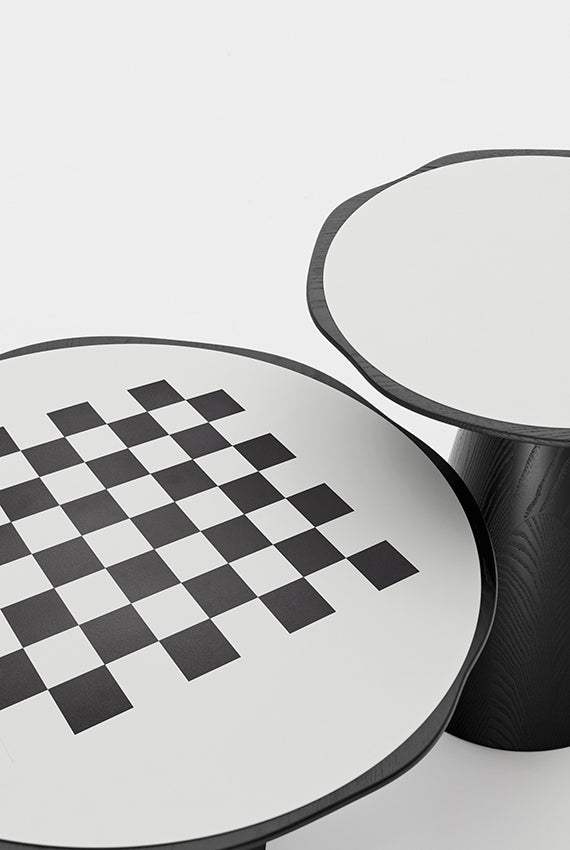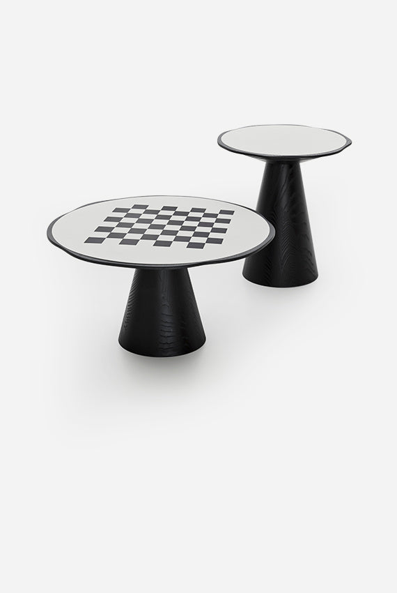 Iconică și geometrică, măsuța de cafea din lemn masiv Scacco evocă formele unei piese de gaming. Baza conică susține un blat cu profil ondulat care adăpostește un blat încastrat, lăcuit și în materiale și culori contrastante cu structura. În partea inferioară a blatului, o canelură facilitează prinderea mesei, care poate fi deplasată cu ușurință prin încăpere pentru noi configurații. Scacco este disponibil în două dimensiuni diferite: măsuță de cafea și o versiune mai înaltă, perfectă alături de canapele și fotolii.