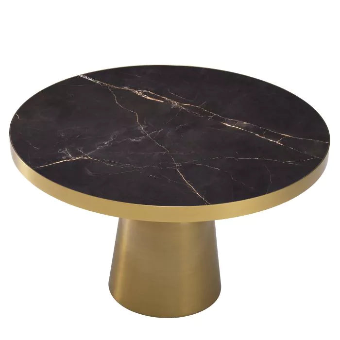 Stilul eclectic în Masa de cafea Soren și contururile sale elegante care îmbină o estetică contemporană cu o senzație modernă. Cadrul din alamă periată deține un blat rotund de marmură ceramică neagră, cu o margine șic din alamă periată.