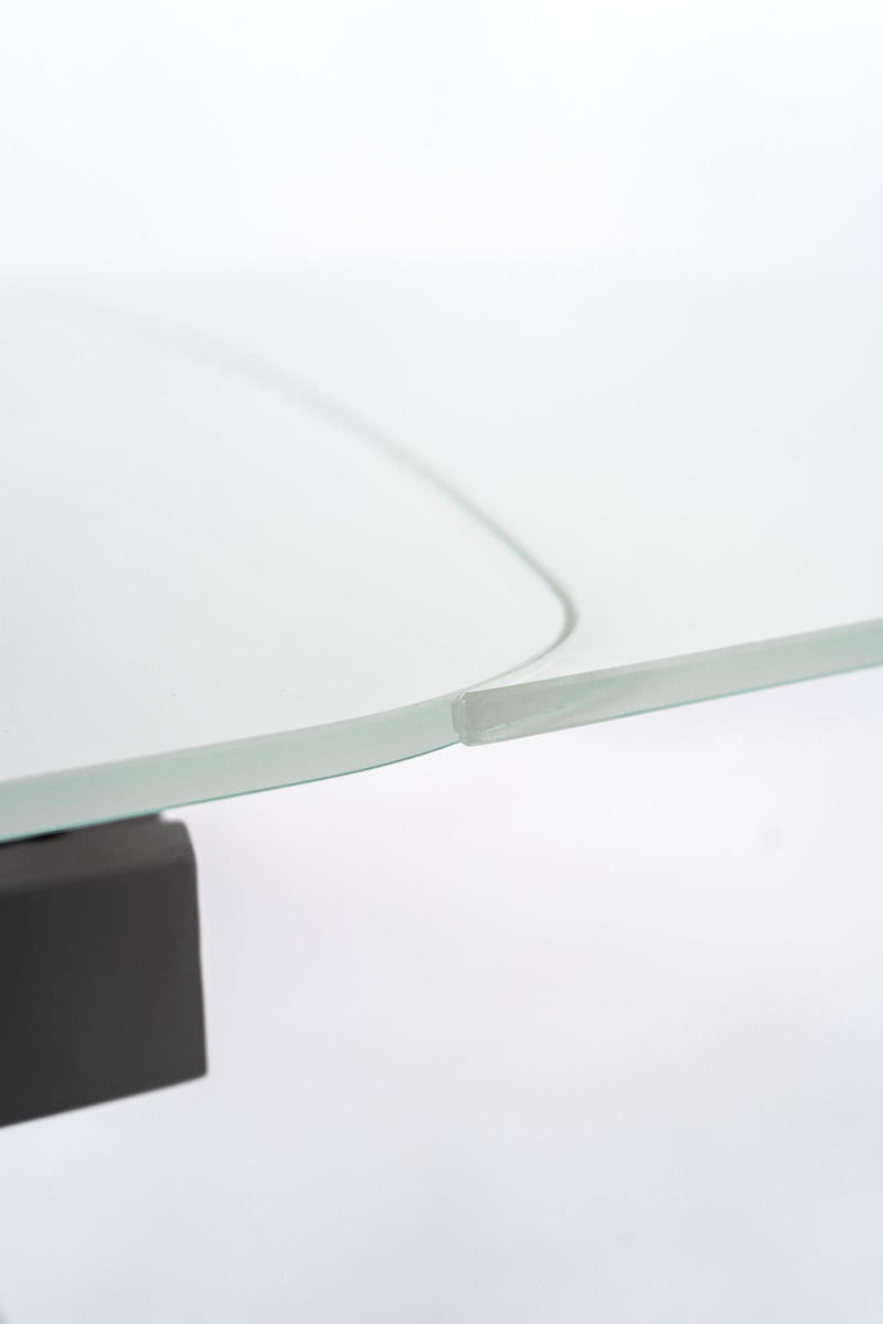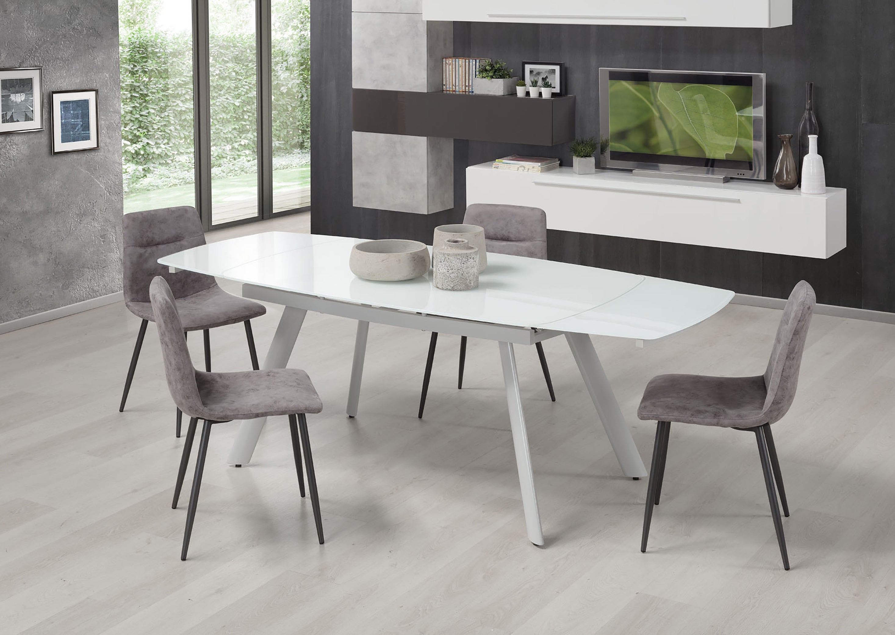 Masa de dining extensibila, cu blat din sticla alba si picioare din metal vopsite.