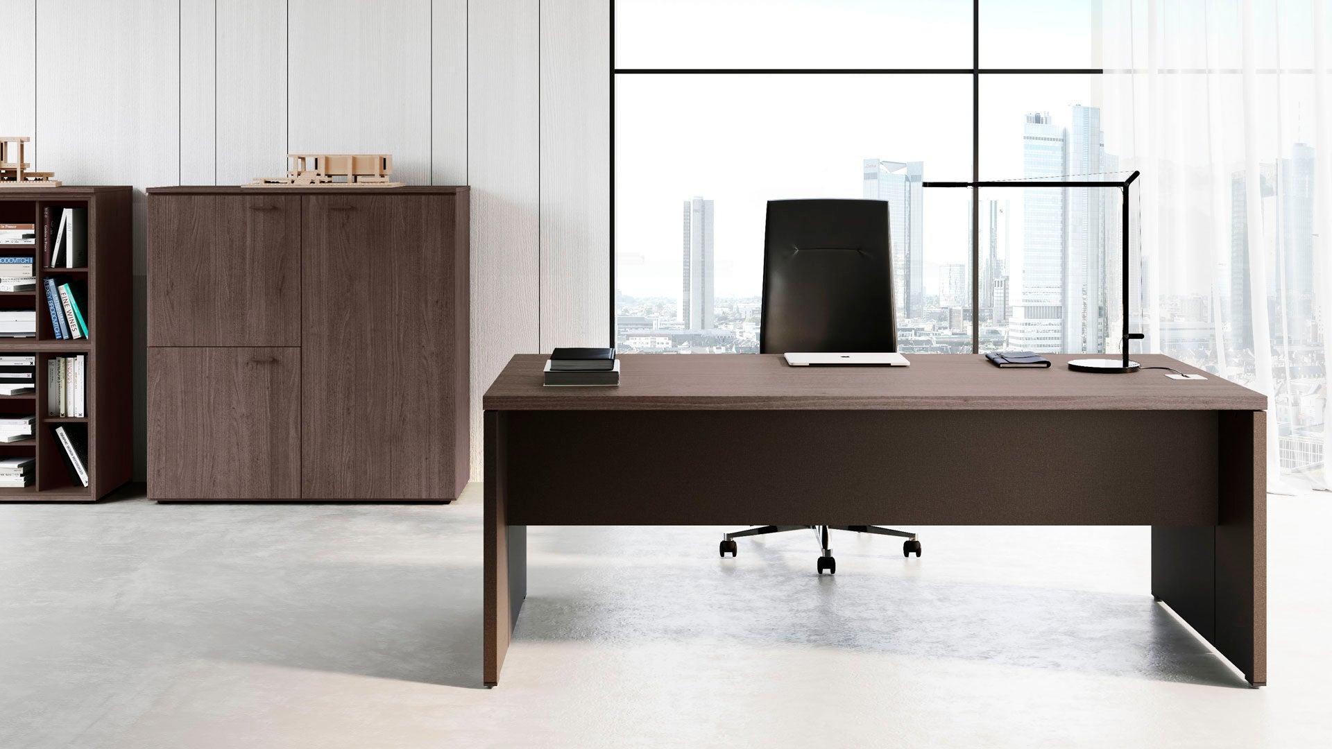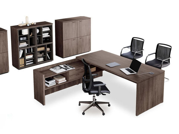 Birou executiv realizat integral din lemn, cu sau fara prelungire, caracterizat prin linii ingrijite si precise. O secvență de panouri de 35 mm se întâlnește, dar nu se ating.