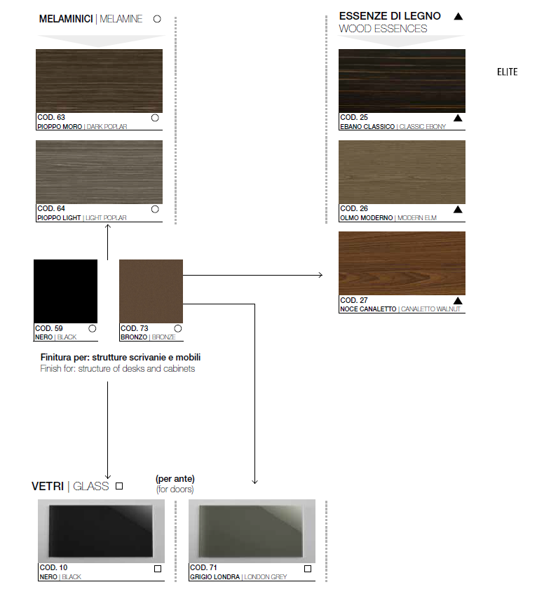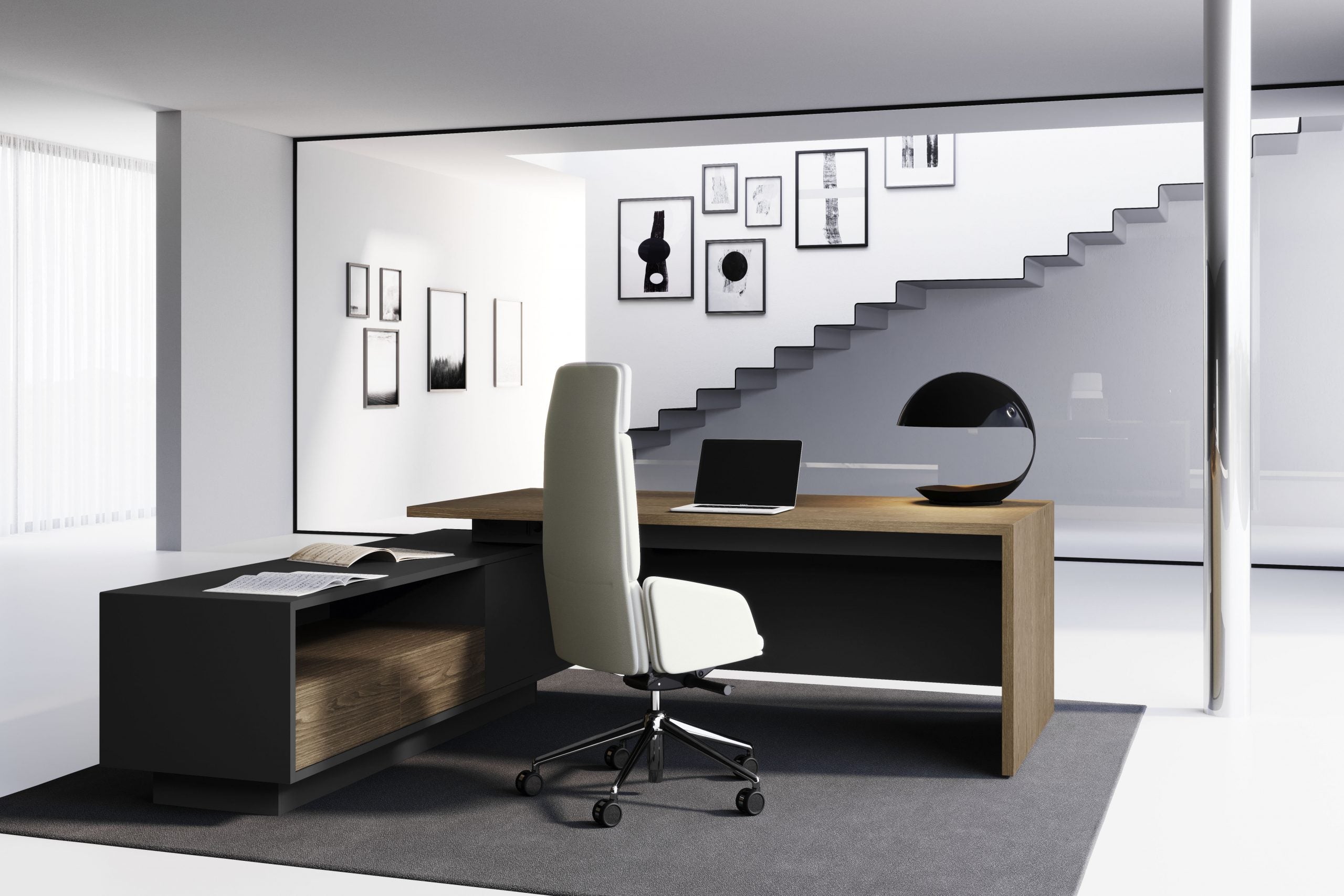 Colecție executivă în care blatul se integrează cu baza structurală care are și funcție de depozitare. Singurele caracteristici de finisare sunt blaturile și ușile unității cu sertare. O stație de lucru funcțională înfrumusețată de lambriuri cu rafturi și iluminare LED opțională.