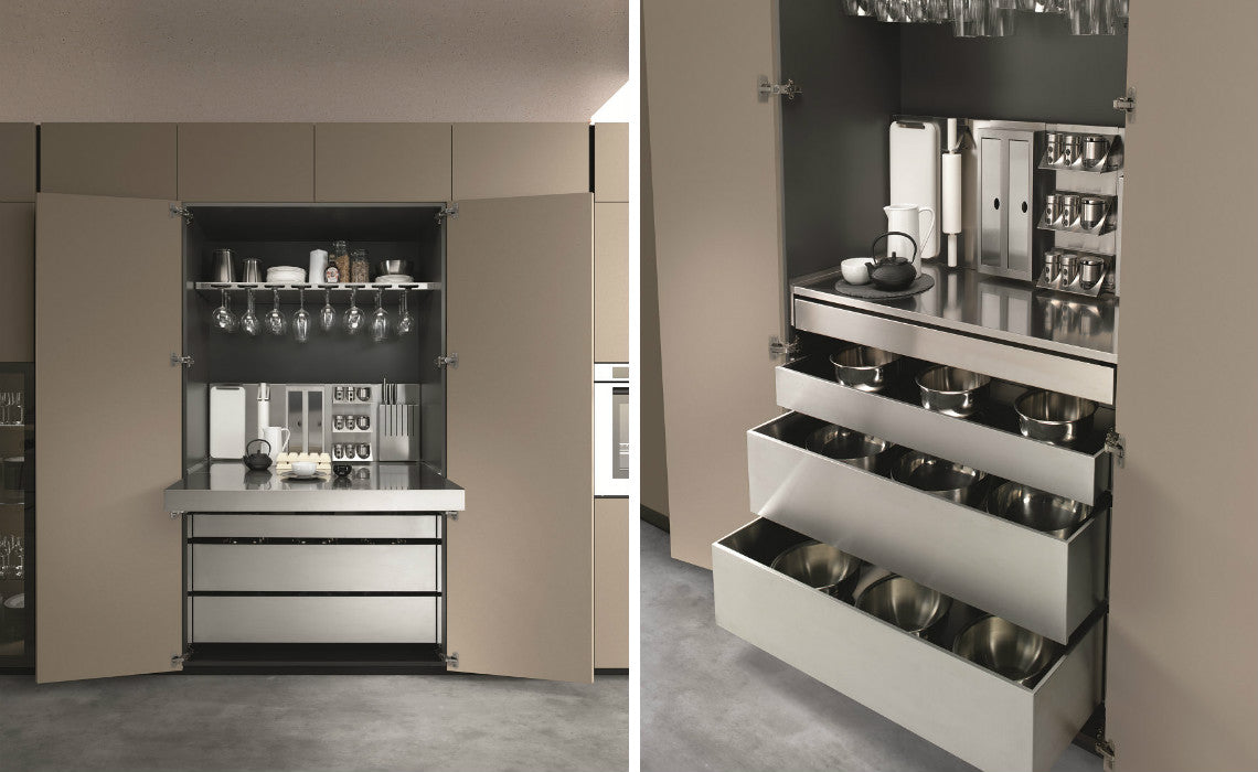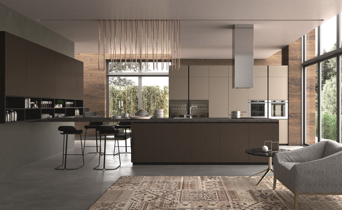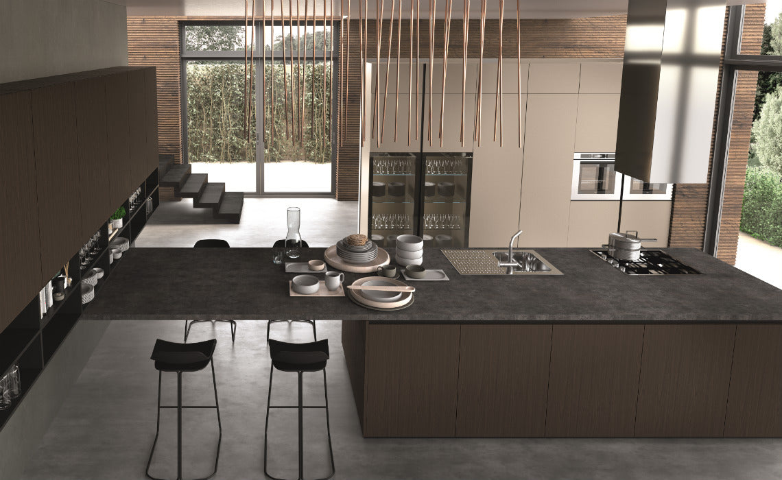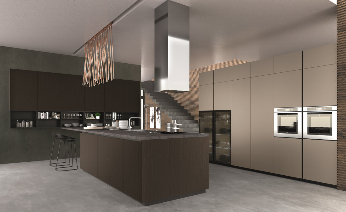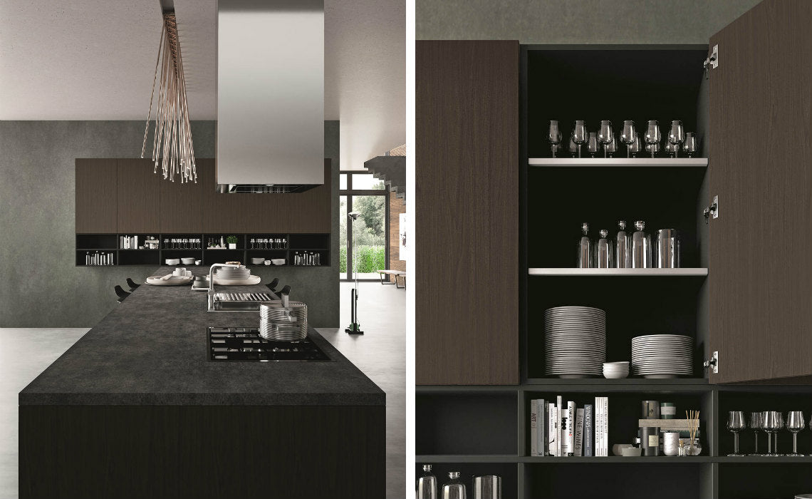 O compozitie aproape etnică care amintește de lumea naturală: o bucătărie care devine un cadru de viață și o sursă de inspirație. P25 unități de bază și de perete, unități înalte în Pet CT189 mat, Vitrine cu profil 103 negru cu sticla fumurie, Elemente deschise antracit Top th.4 Vulcanic 3279.