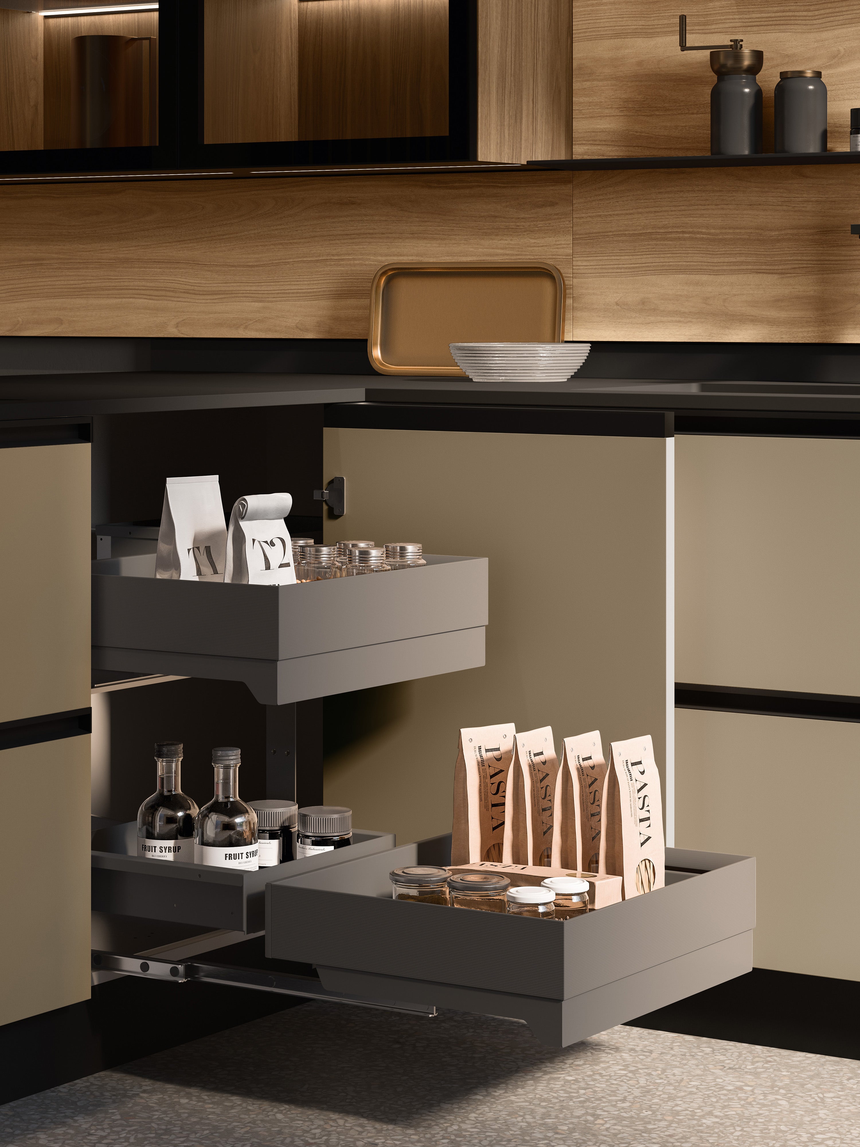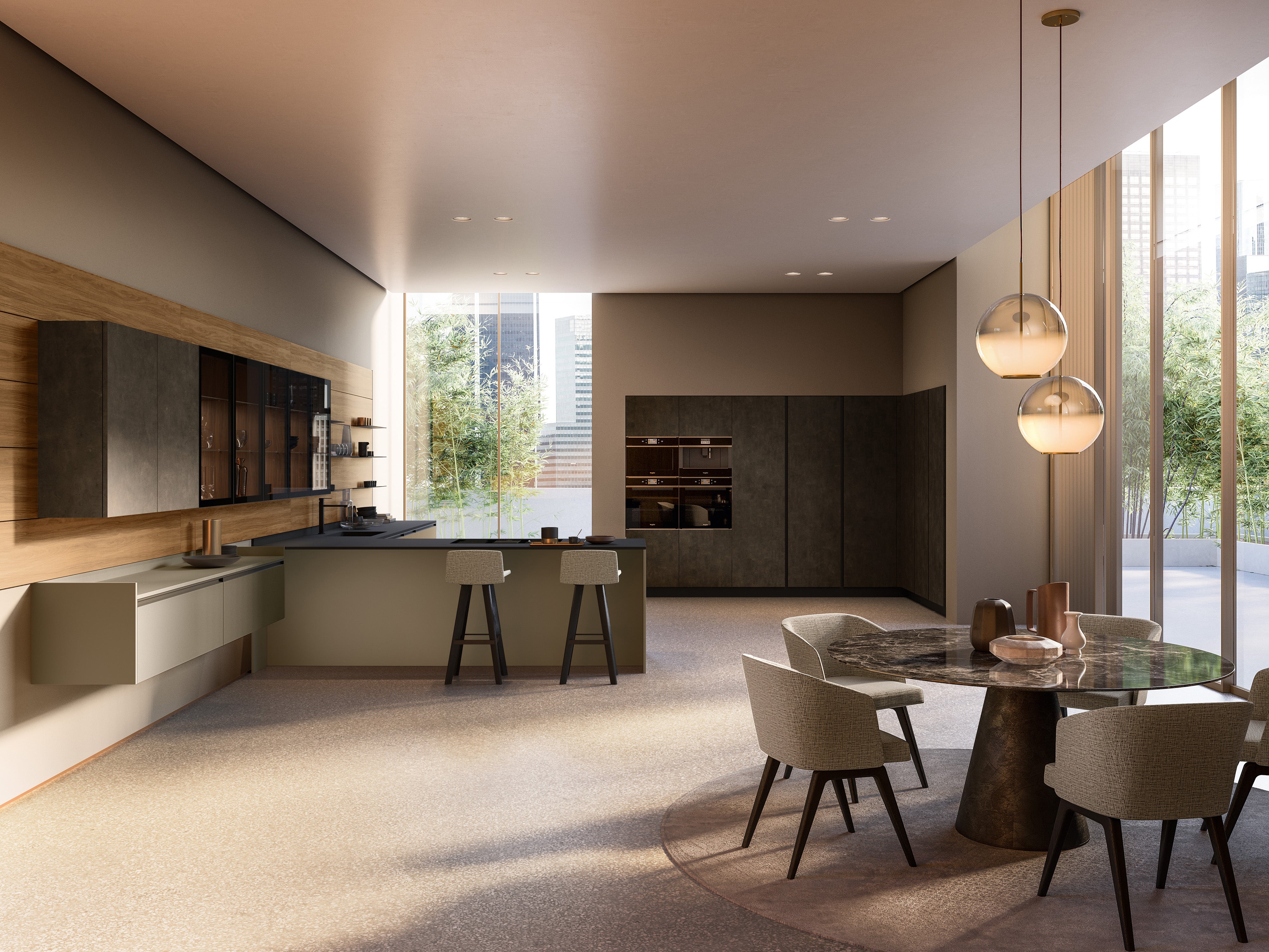 Unitățile de bază și peninsula sunt lacuite UV X-Silice Mat, cu mâner integrat Ring care asigură continuitate cu sistemul modular de lame Infinity. Vitrina elegantă Frame cu uși din aluminiu și sticlă fumată și interiorul din melaminat Noce Caramel fac o declarație rafinată și elegantă în bucătărie.