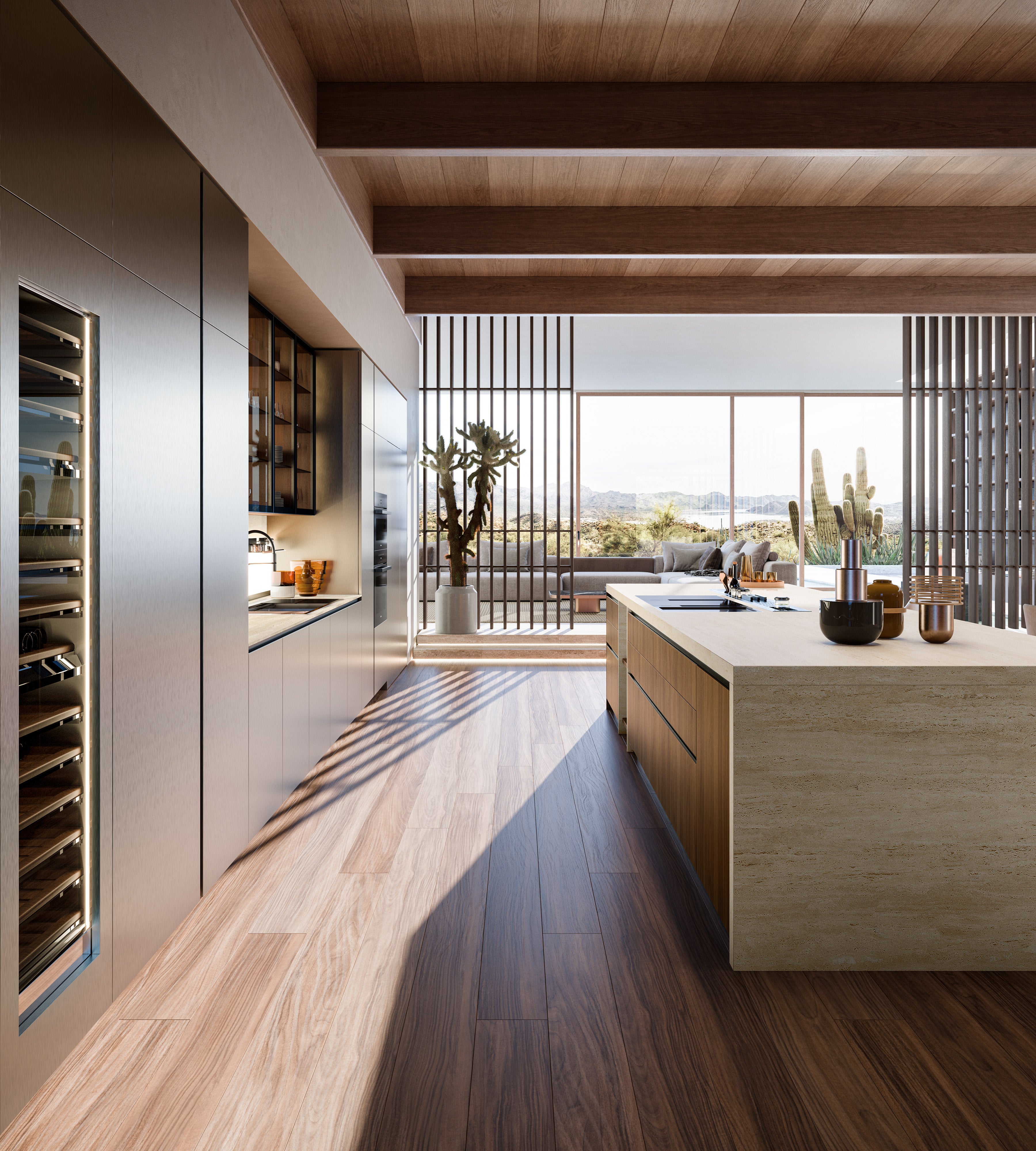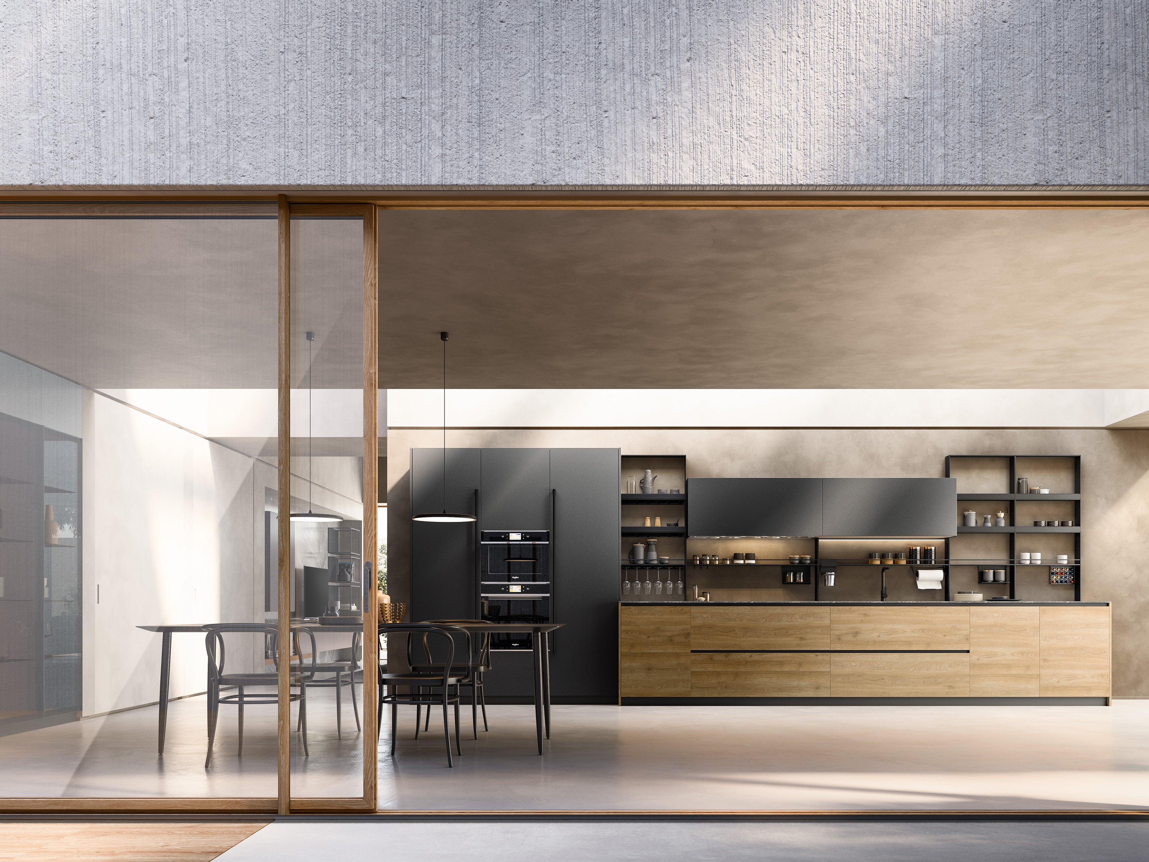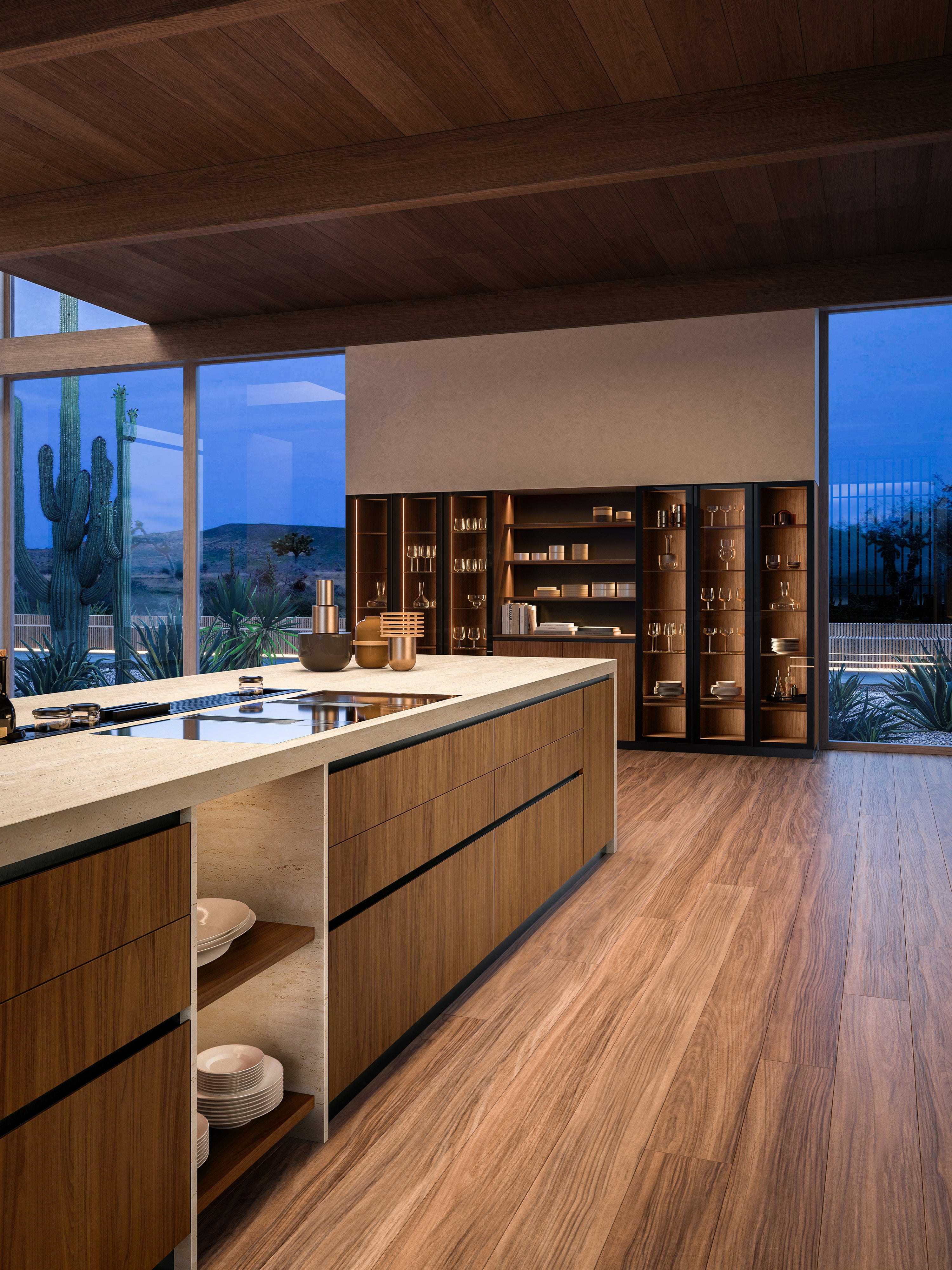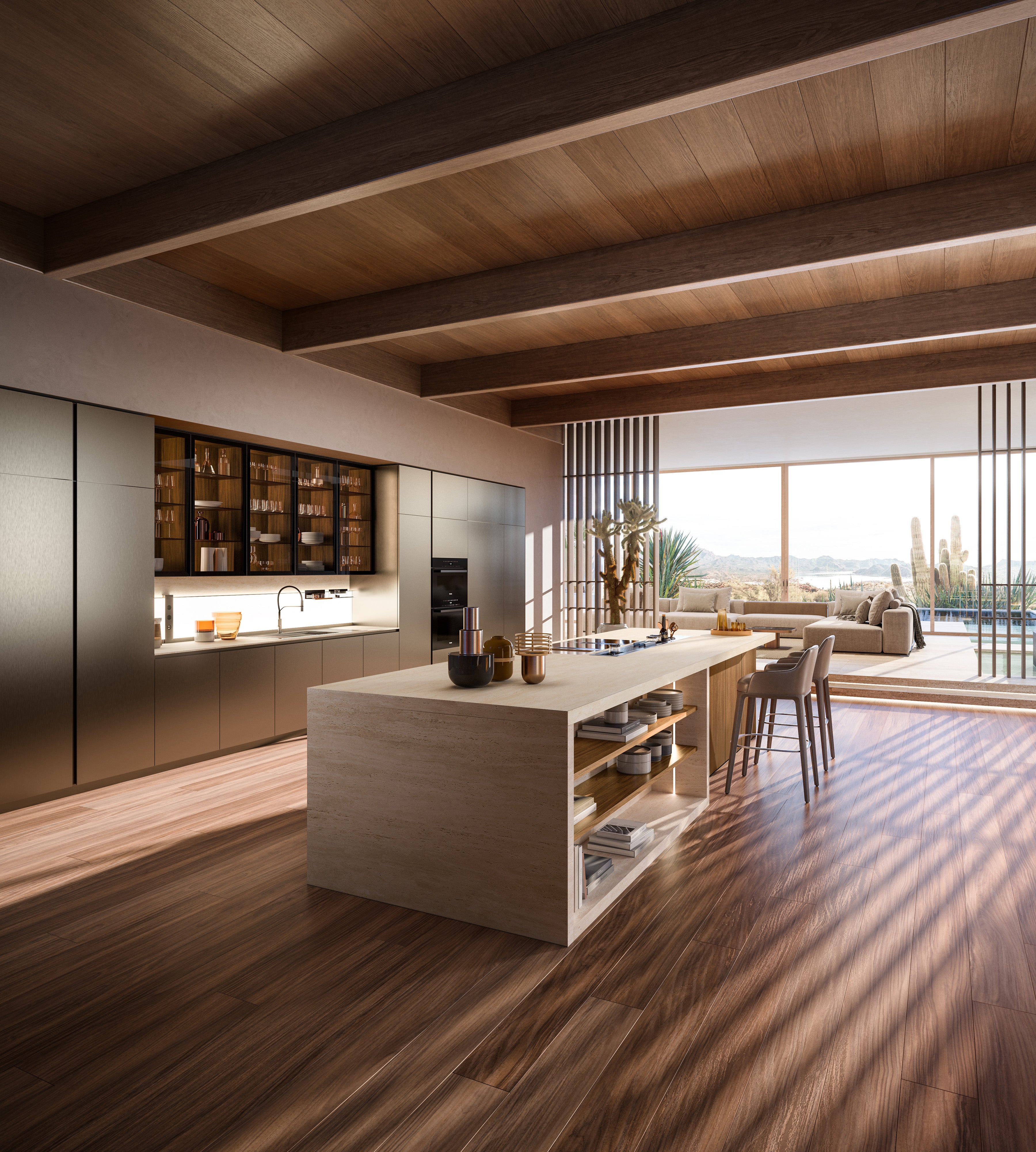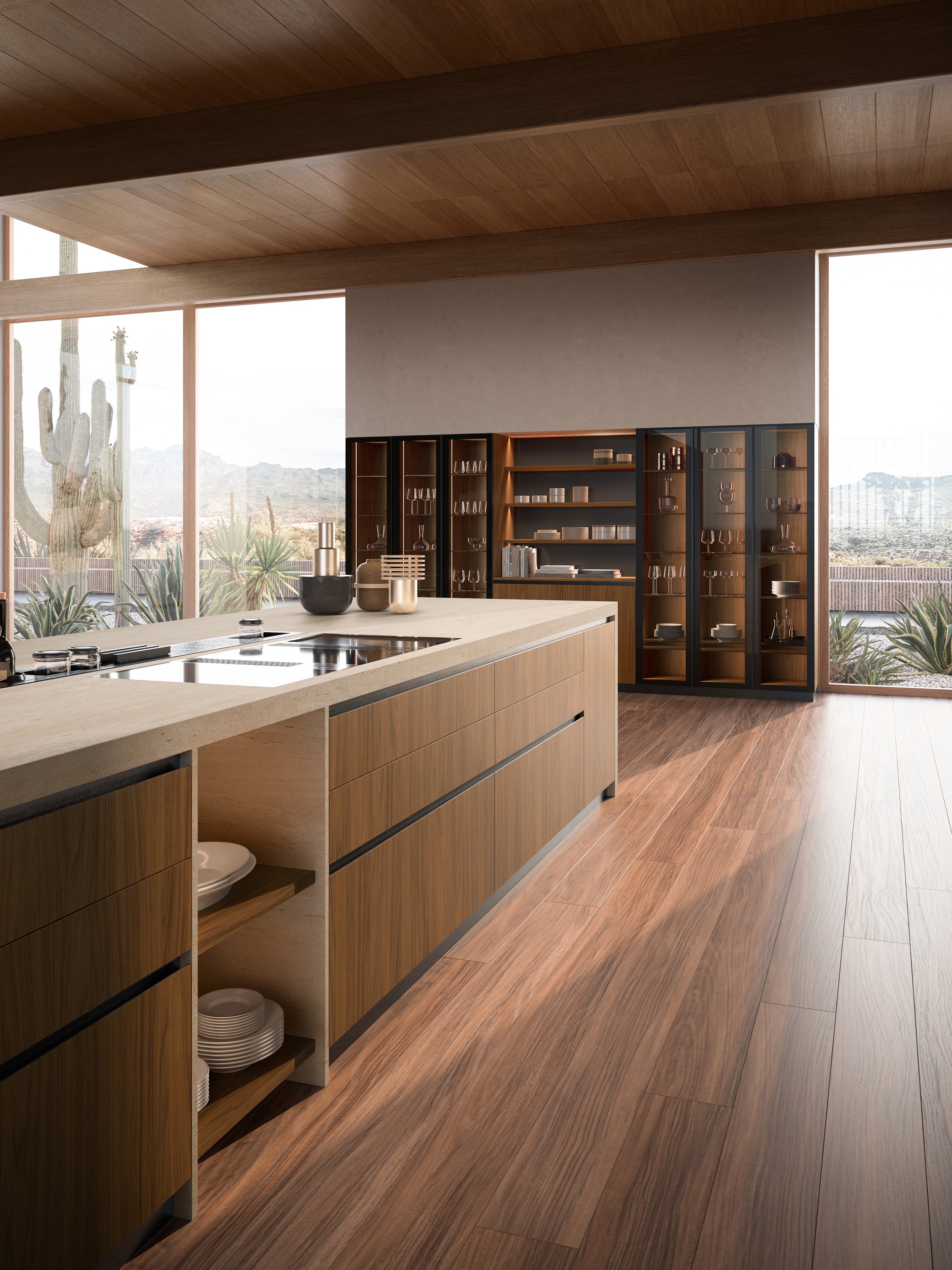 O bucătărie caldă, însorită, care comunică cu exteriorul. Utilizarea furnirului de lemn Noce și a metalului lacuit Ambra, cu suprafața sa nervură și mânerul Zeta integrat în ușă, evidențiază designul esențial, funcțional și armonios al compoziției.