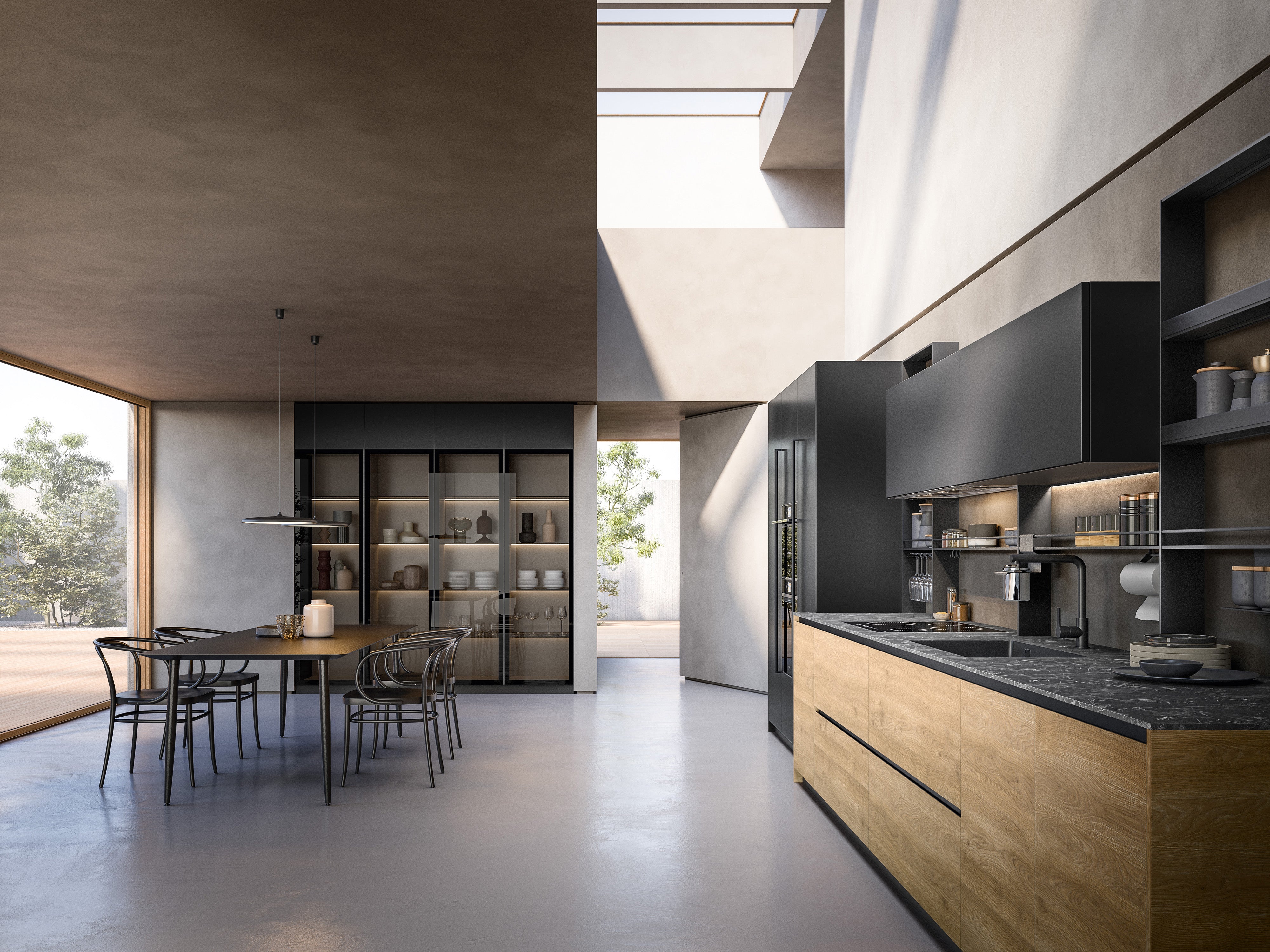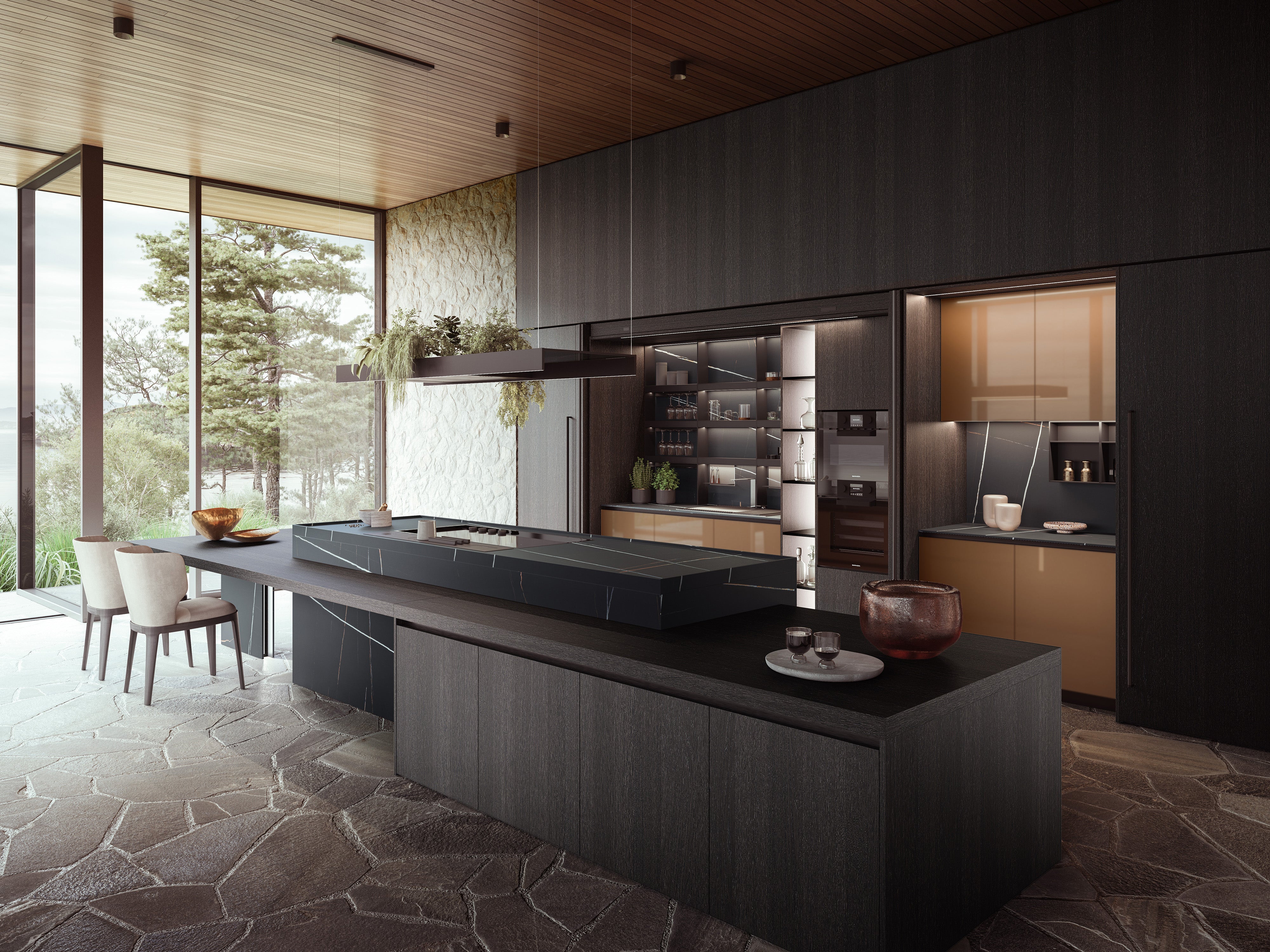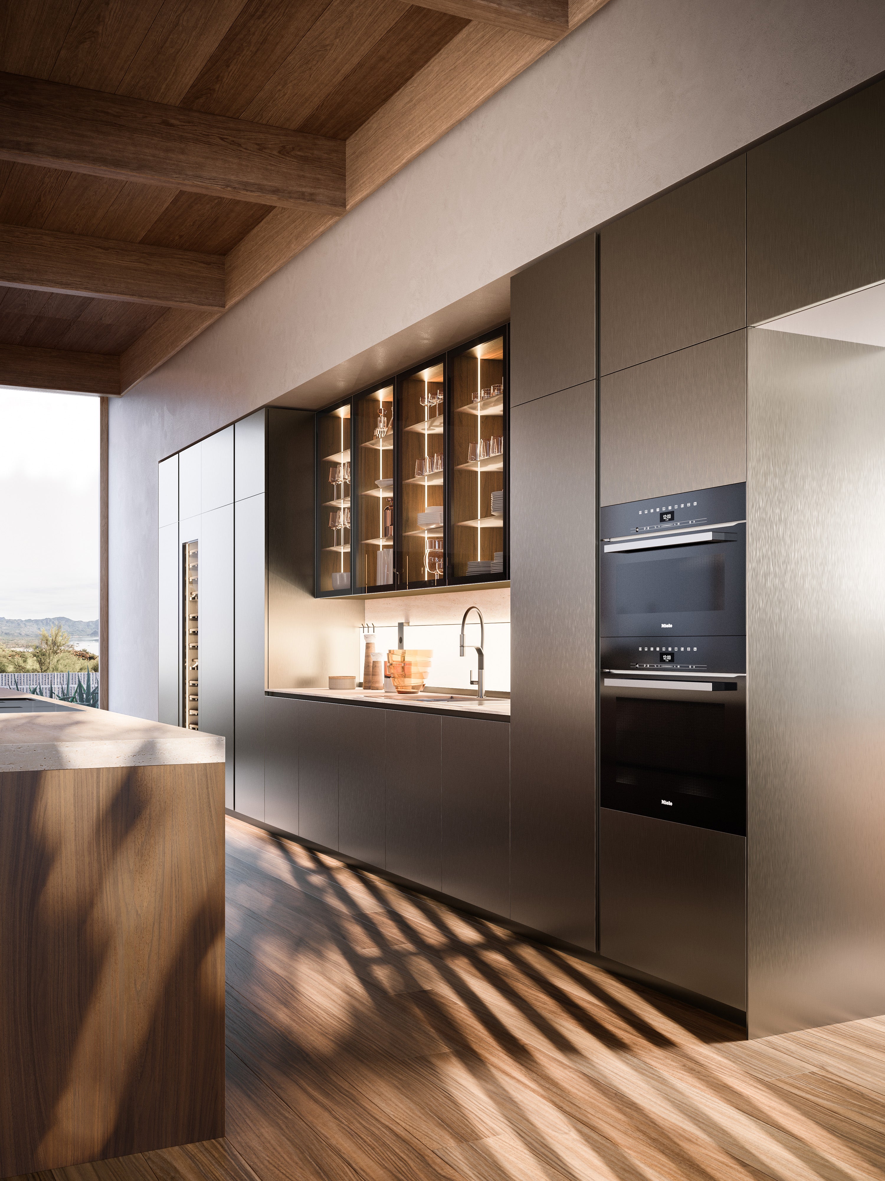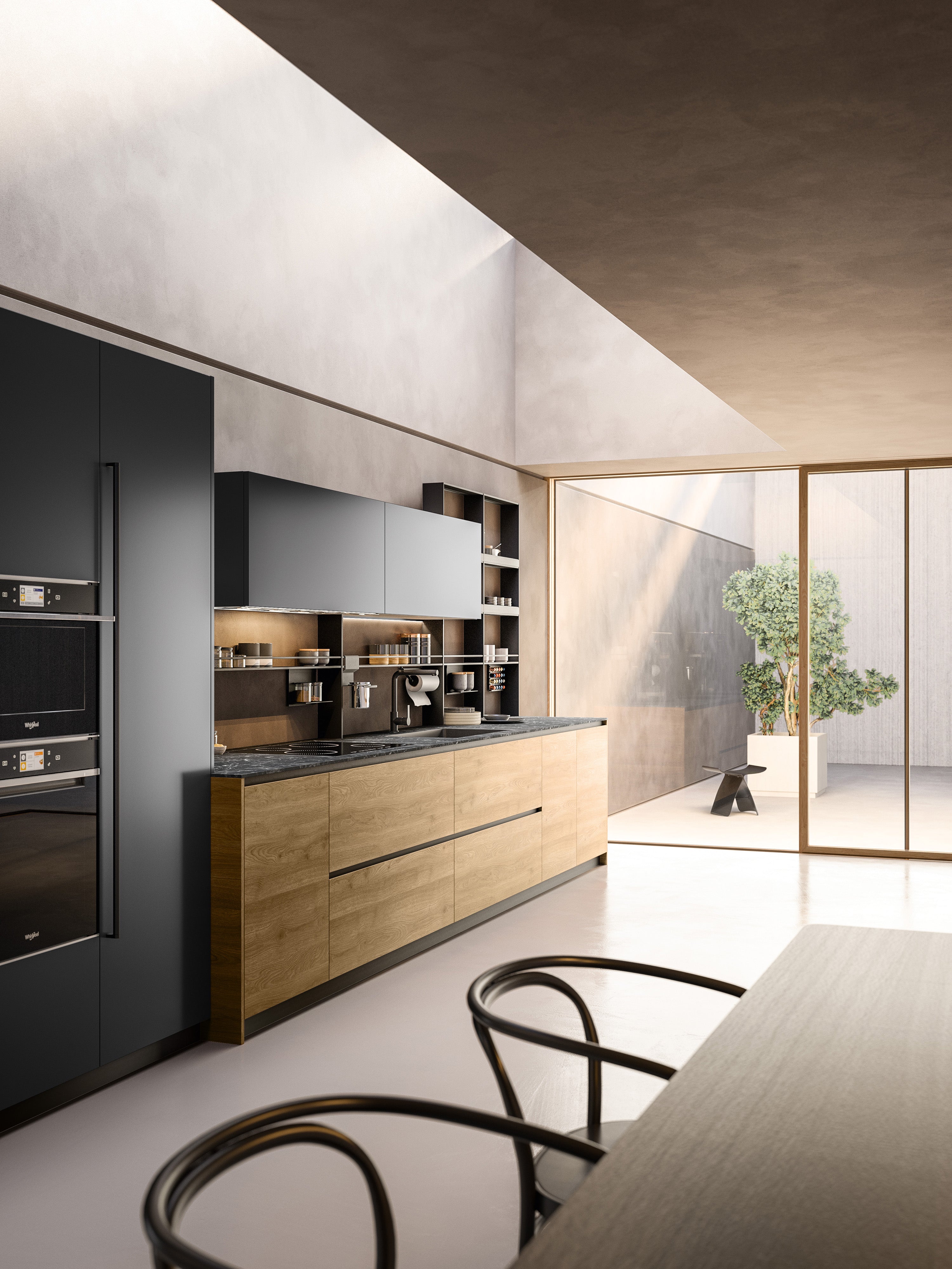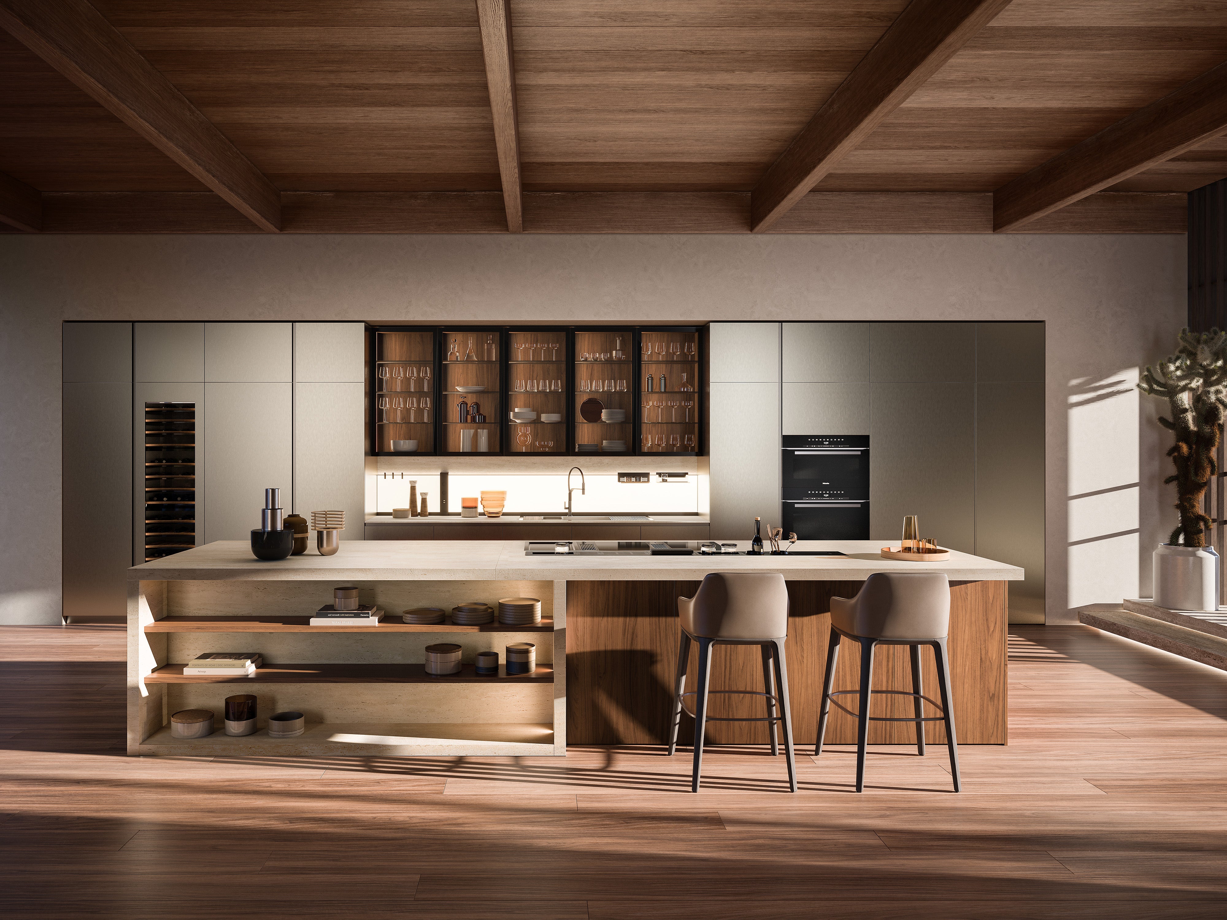 O bucătărie caldă, însorită, care comunică cu exteriorul. Utilizarea furnirului de lemn Noce și a metalului lacuit Ambra, cu suprafața sa nervură și mânerul Zeta integrat în ușă, evidențiază designul esențial, funcțional și armonios al compoziției.